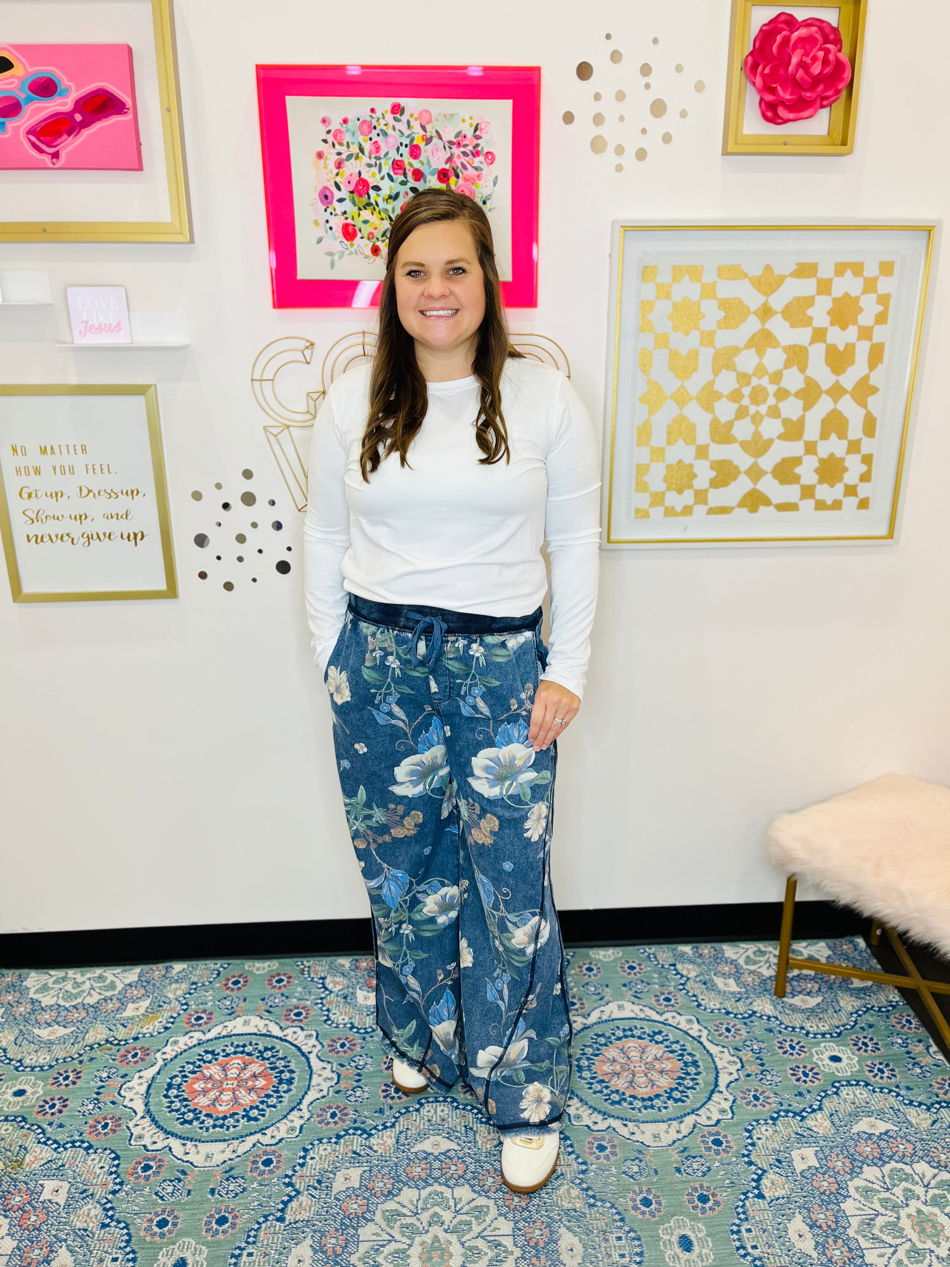Bring a fresh twist to denim days with the Bloom & Blue Washed Denim Pants. Featuring a soft floral print on vintage-washed denim, these pants combine laid-back charm with feminine flair. The relaxed wide-leg fit and cropped length keep the look effortlessly cool, while the raw frayed hem adds just the right touch of edge. Finished with an elastic waistband and adjustable drawstring tie, they promise all-day comfort with an easy, customizable fit. Perfect for pairing with simple tees or breezy blouses for an on-trend, everyday style.