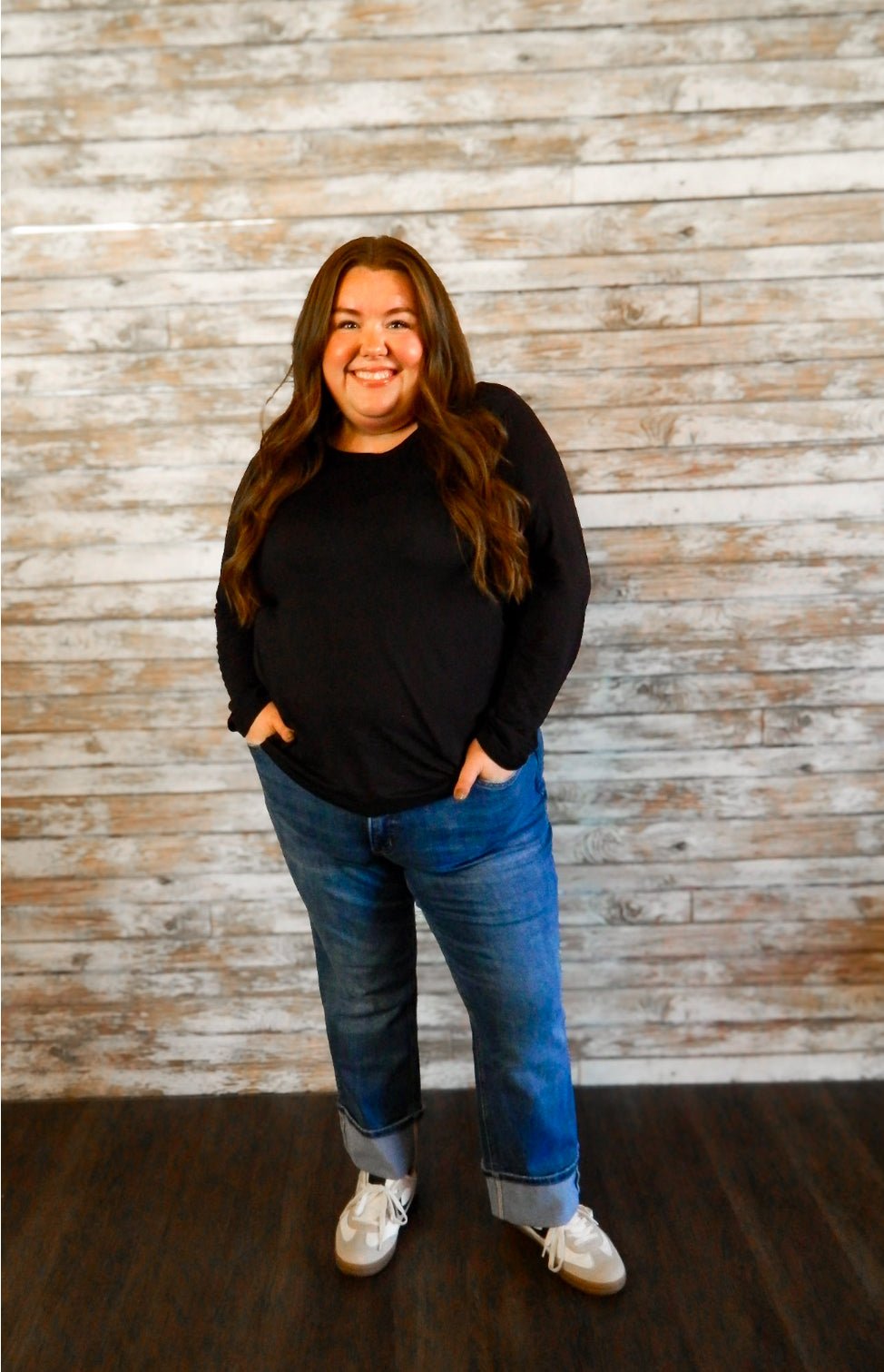 High-rise jeans that sit up at the waist, made with comfort-stretch denim. They have a straight leg down to the ankle and a 4" single cuff hem. Polished but casual, great for showing off shoes like flats, booties, or sneakers.