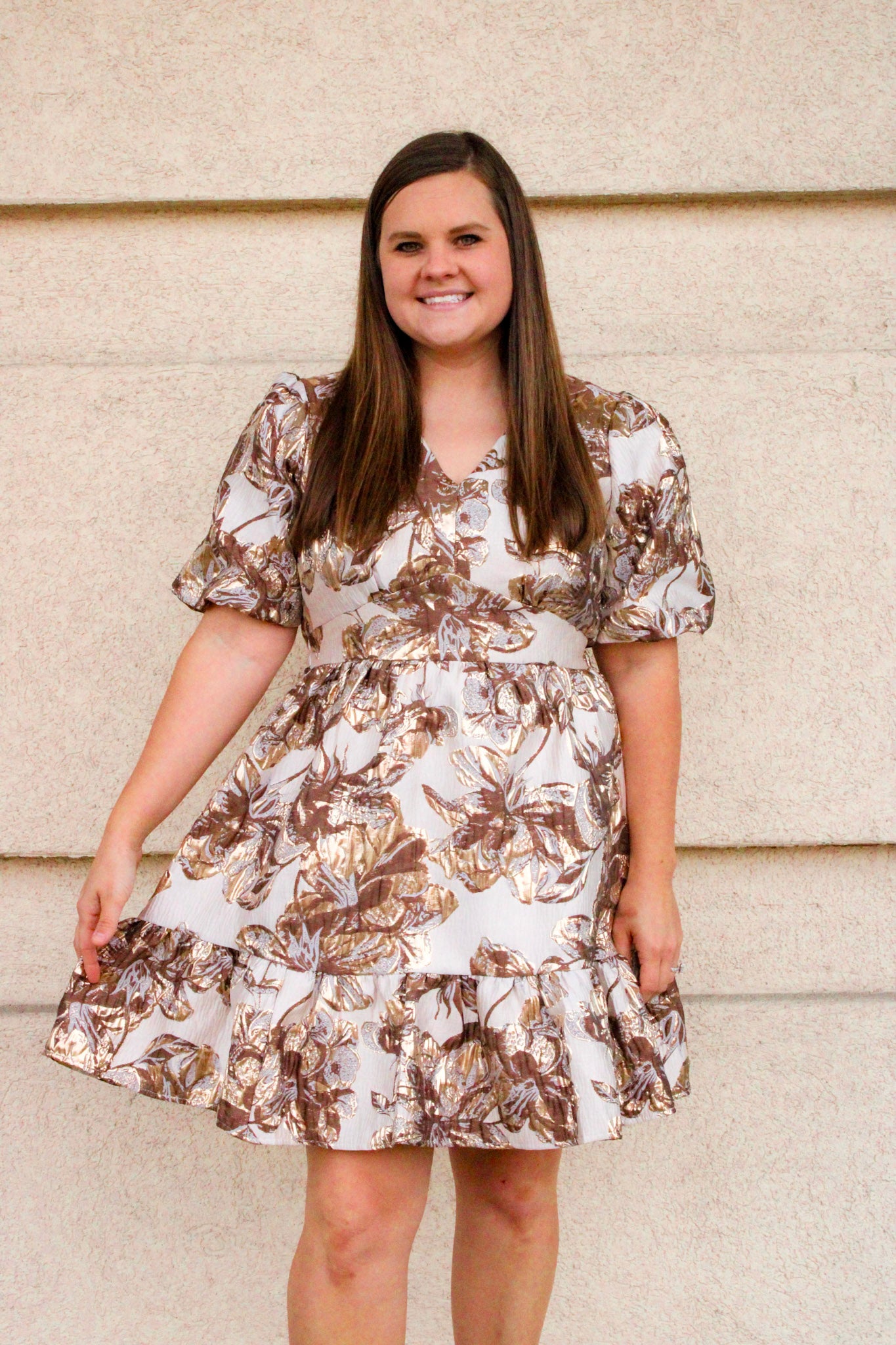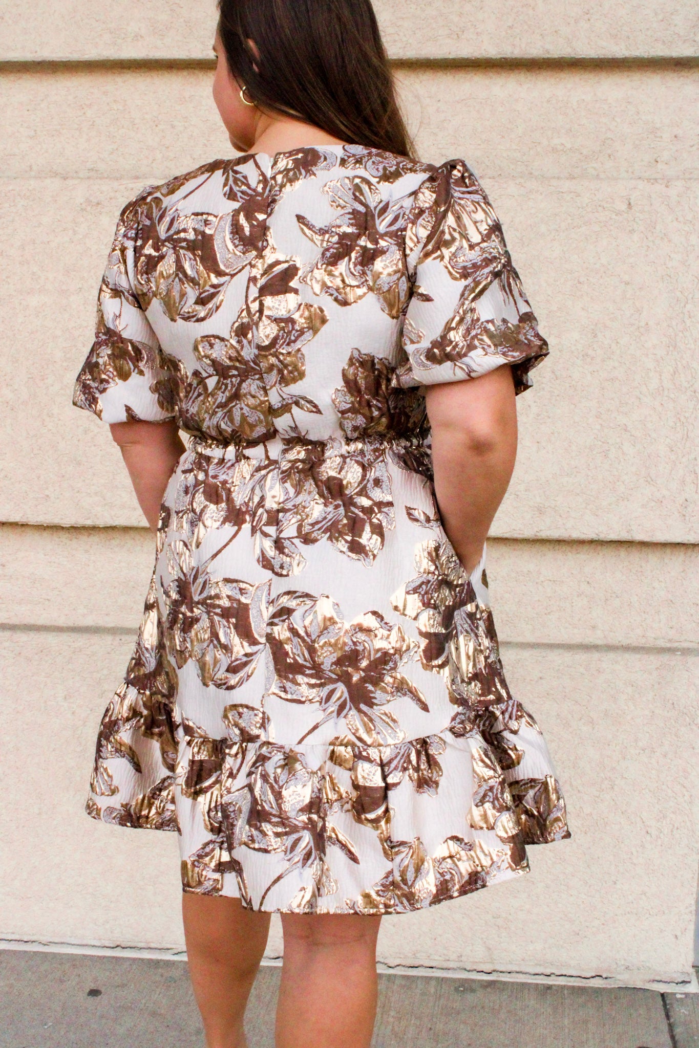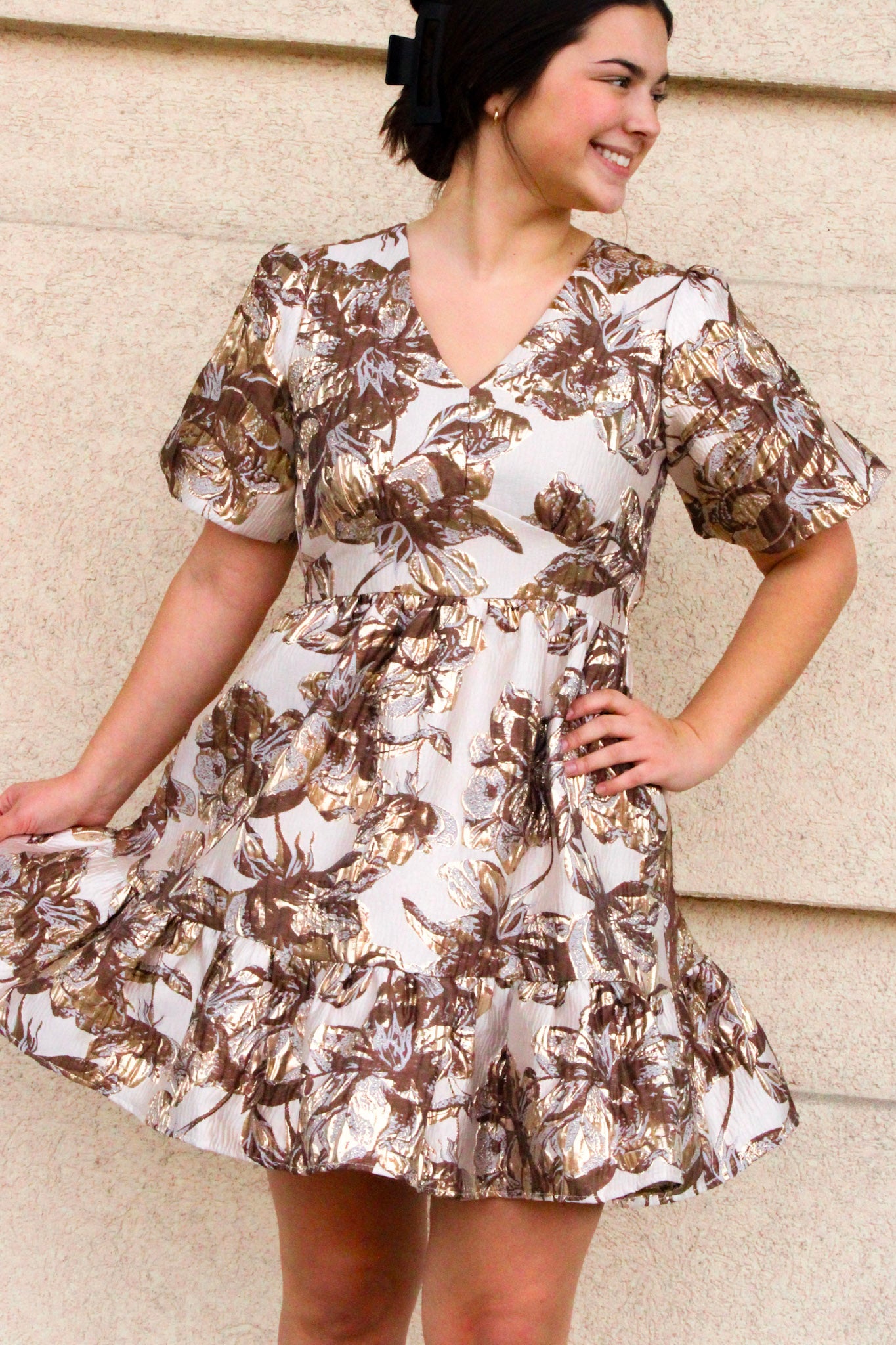 Step into timeless elegance with the Mocha Luxe Dress, a stunning blend of rich mocha tones and subtle gold shimmer. This woven jacquard mini dress features short puff sleeves and a flattering V-neckline that add a touch of feminine charm. The back elastic waistband ensures a comfortable, figure-flattering fit, while side pockets bring practicality to this polished look. Perfect for holiday parties, fall weddings, or date nights, this mocha and gold dress shines with effortless sophistication. ✨