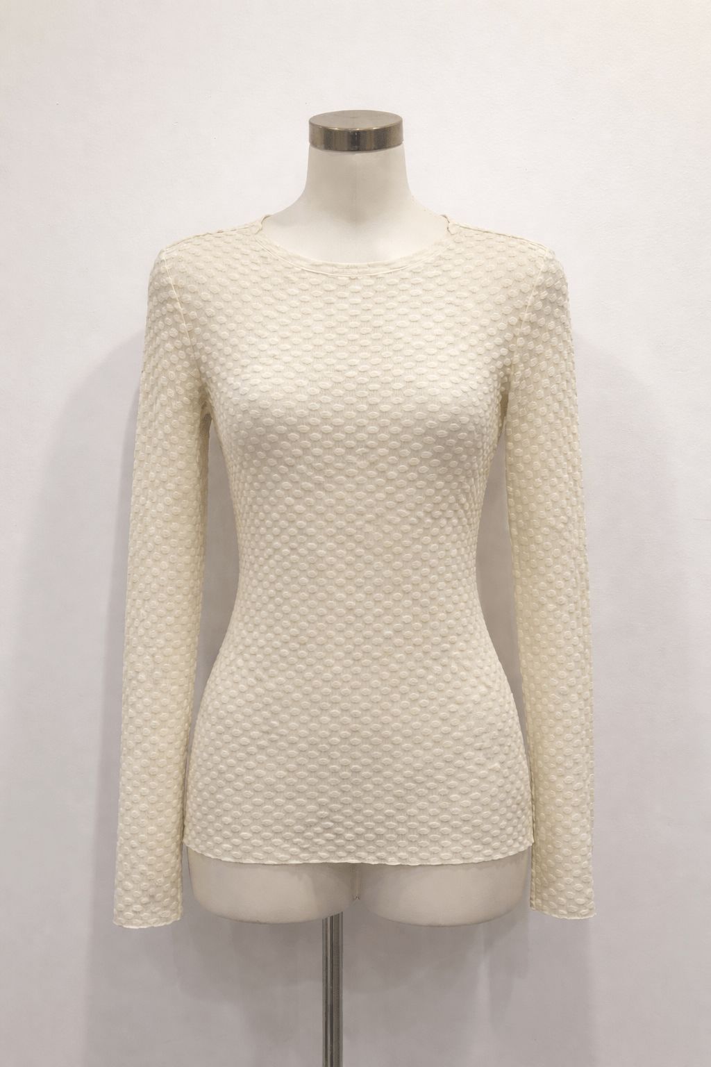 Upgrade your wardrobe with this charming Dot Lace Mesh Top in Cream. Perfect for any occasion, this top features a round neck and long sleeves, making it versatile and stylish. The dot lace mesh adds a touch of elegance while still being a playful addition to your outfit. (You'll be the cream of the crop in this top!)
