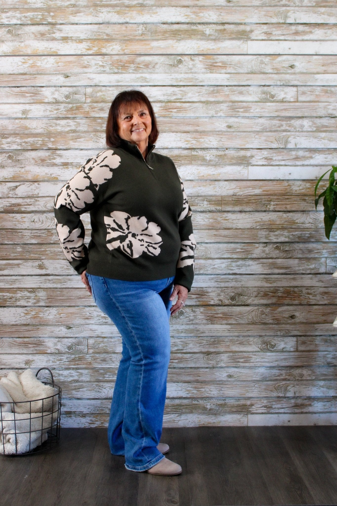 The Garden Path Sweater brings effortless style and cozy comfort together in one versatile piece. Featuring long sleeves and a half-zip neckline, this sweater is decorated with a delicate floral pattern for a fresh, feminine look. Its relaxed fit makes it perfect for layering over jeans, leggings, or skirts for a polished yet comfortable outfit.
