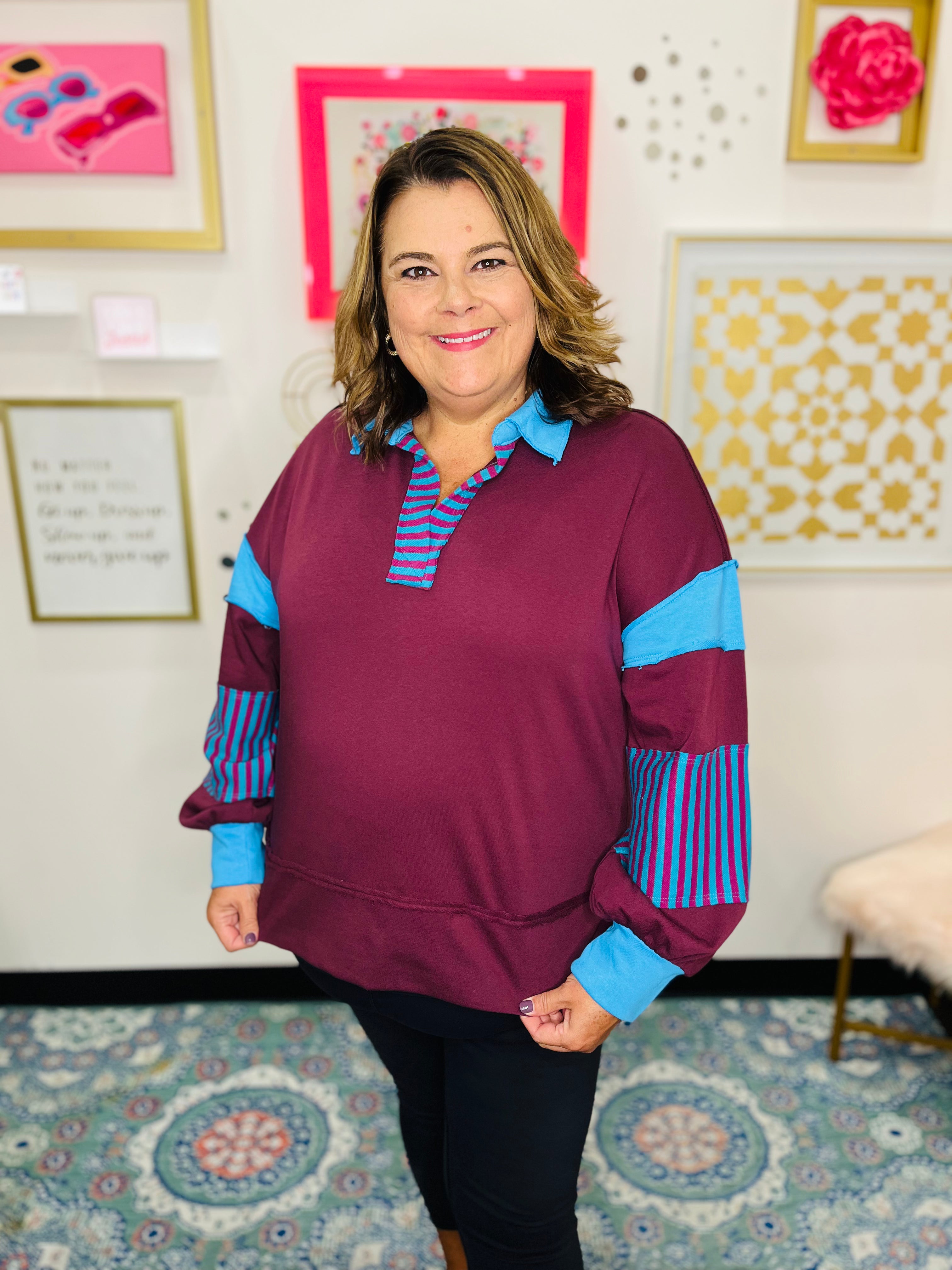 SEO keywords included: puff sleeve hi-low top, fabric mix blouse, side slit top, raw cut edge top, women’s boutique top, statement sweater top.
