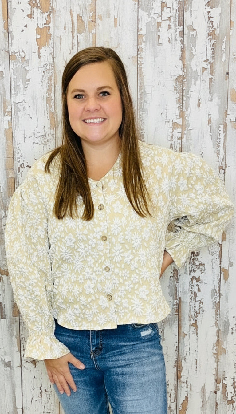 The Petal Ruffle Top is a chic blend of femininity and everyday style. Designed with a textured floral pattern, flattering v-neckline, and delicate ruffle accents, this top brings a soft, romantic touch to any look. Lightweight and versatile, it pairs effortlessly with jeans, skirts, or trousers, making it a boutique-worthy piece you can wear from day to night.