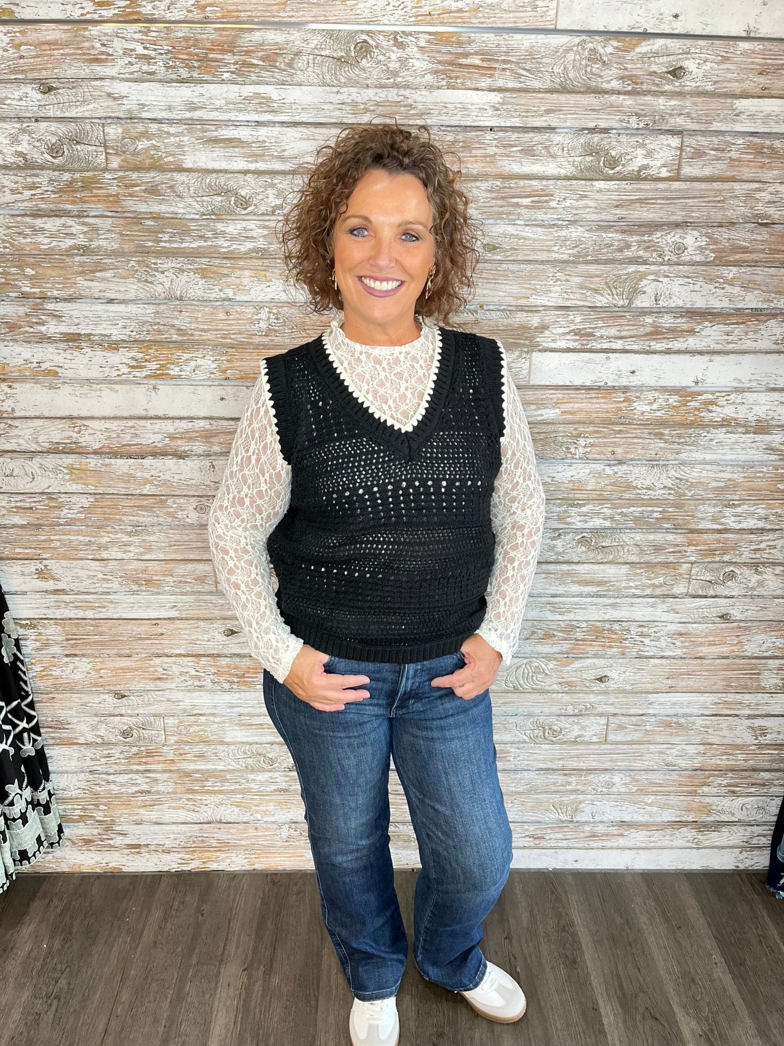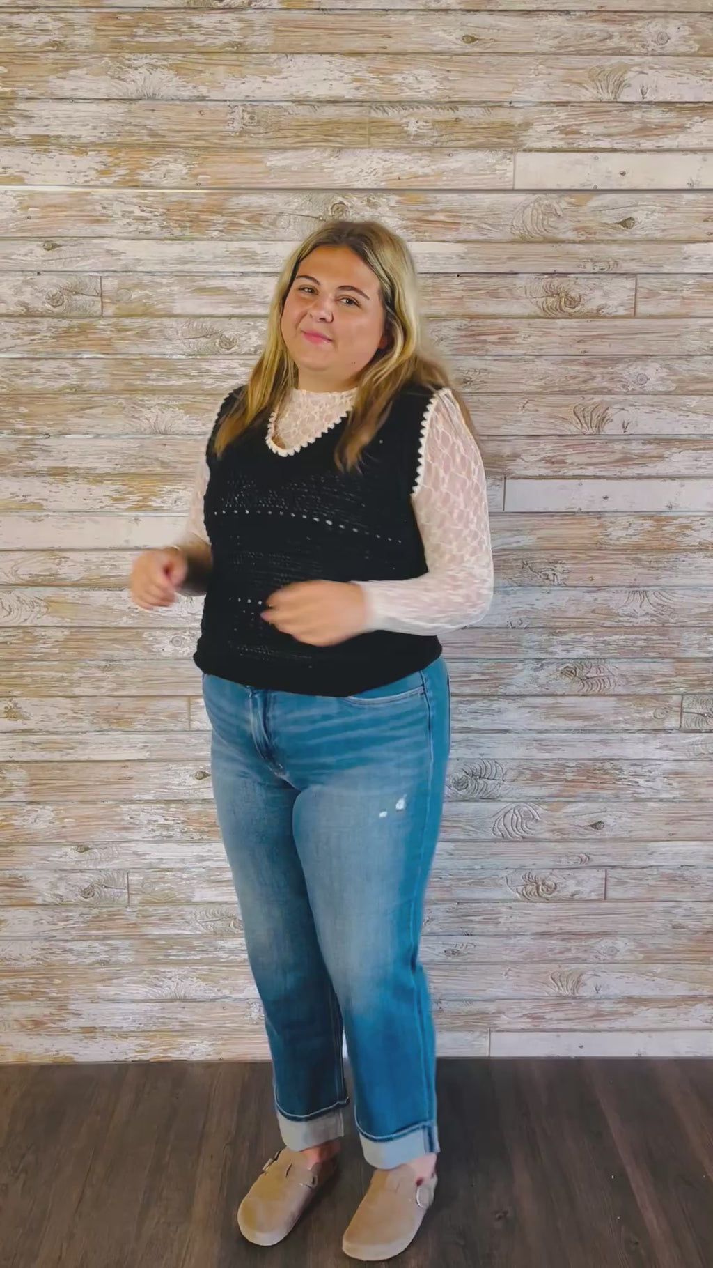 Aubree (Blond/brown hair) is wearing the black vest, size Large.
