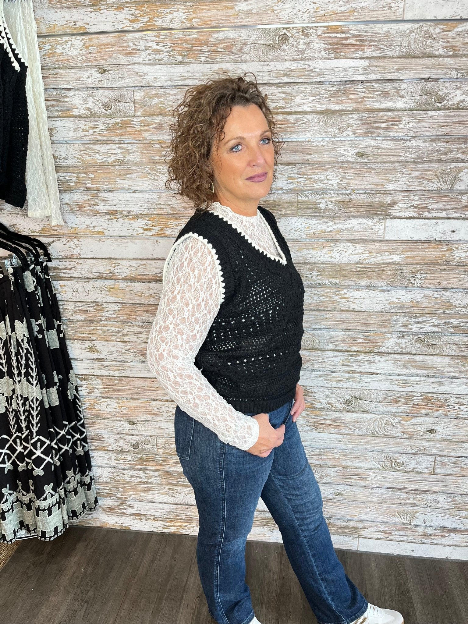 Avory (Long, dark hair) is wearing the taupe vest, size Small.