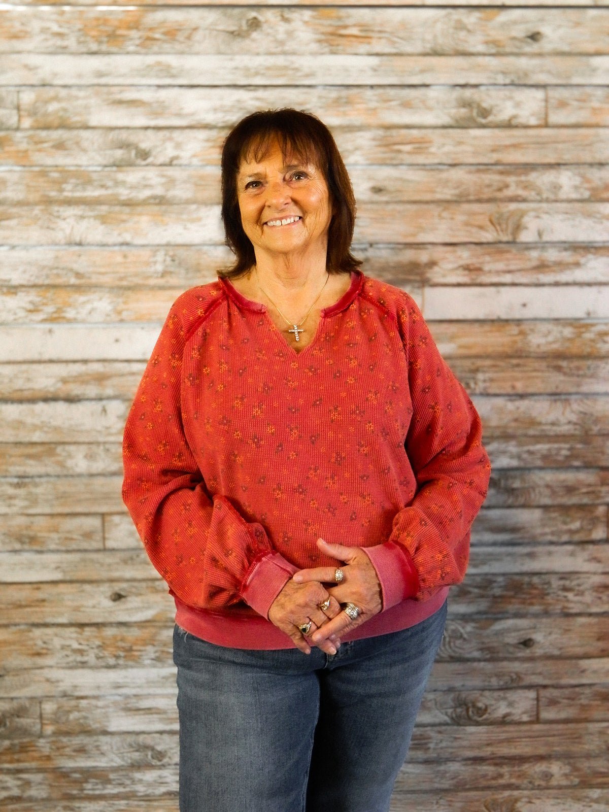 Embrace effortless comfort with the Wildflower Cozy Knit. Crafted from soft, mineral-washed thermal knit, this relaxed, loose-fit top features a notched V-neckline and ribbed cuffs and hem for classic style. Delicate mini floral print detailing adds a subtle, feminine touch, making it perfect for layering or pairing with jeans and leggings for an easy, everyday boutique-ready look.