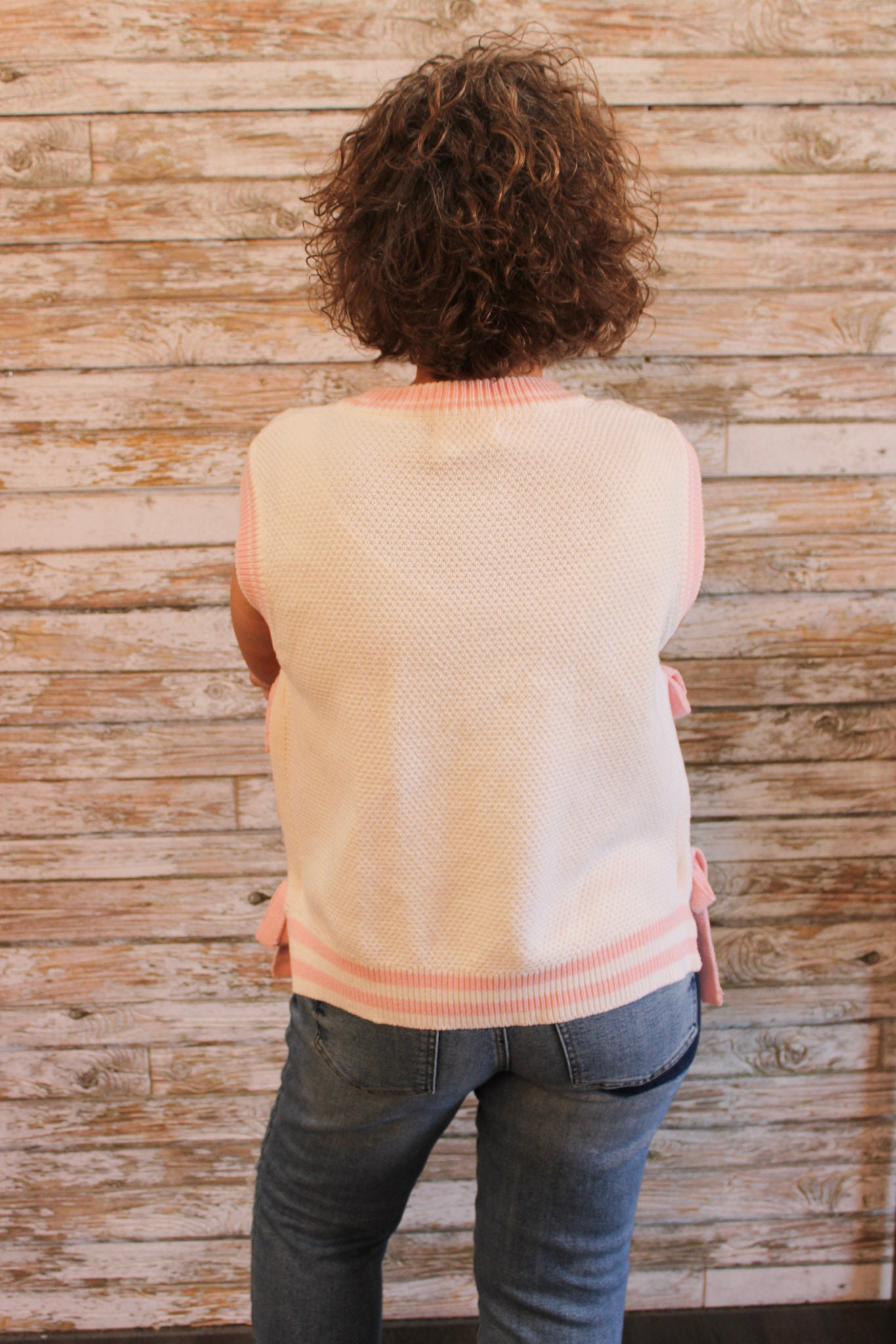 Get ready to charm your way into every room with this playful and chic knit sweater vest. Complete with a cute ribbon bow adorning the side, this vest is perfect for adding a touch of whimsy to any outfit. A must-have staple for the fun-loving fashionista!