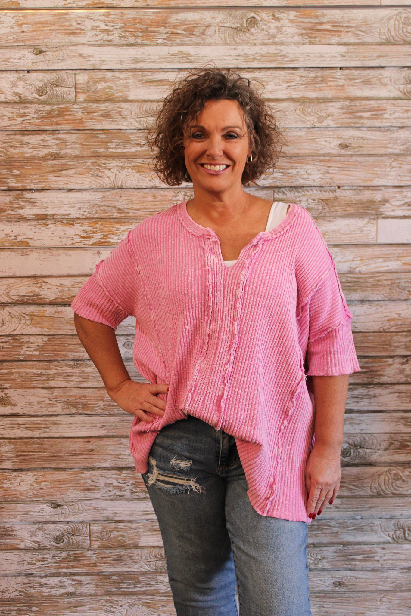 Get ready to elevate your style with the calypso pink Set The Vibe Top. Made from a unique textured rib knit material with a trendy mineral wash, this top is anything but basic. It features short sleeves with dropped shoulders, a rounded V cut neck, and raw cut and frayed seams for added edge. With a relaxed and loose fit and a slightly uneven hem, this top is perfect for adding some carefree charm to your look.