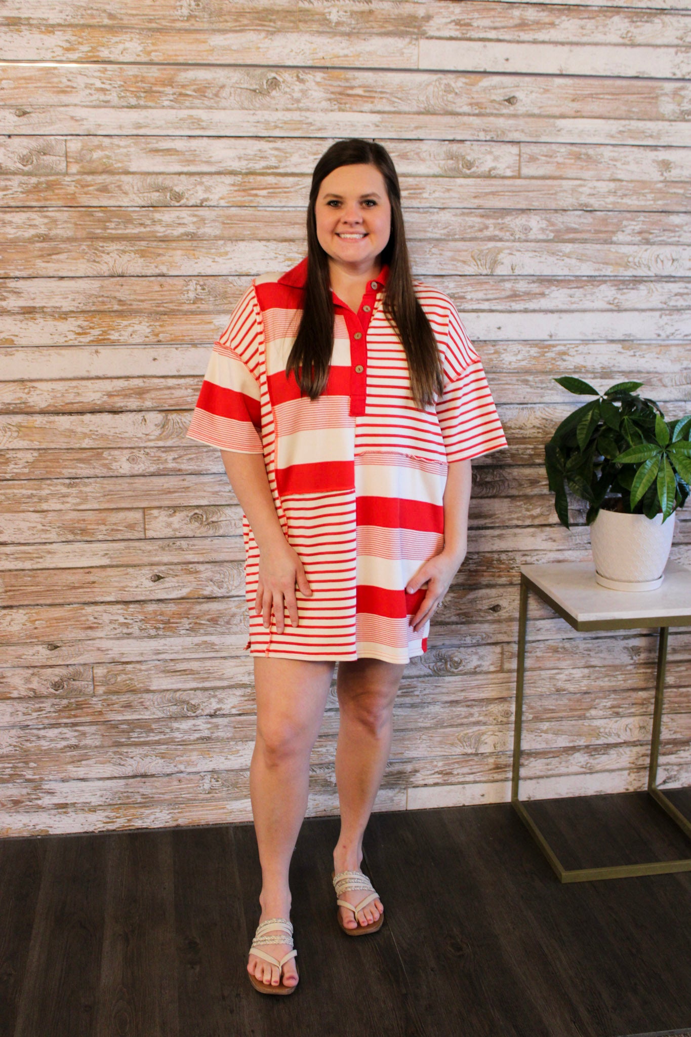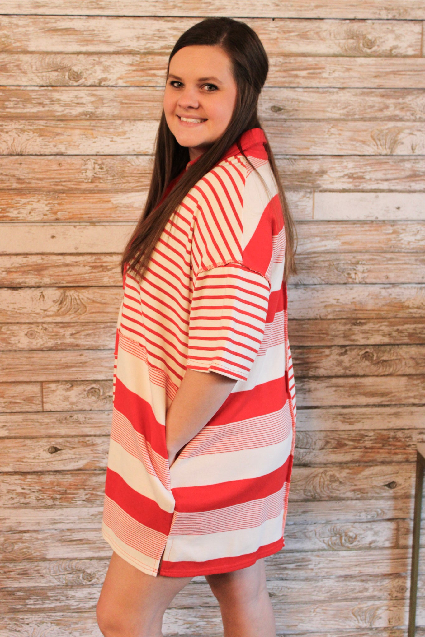 Discover your signature style with our playful and versatile dress! Featuring a unique mix of multi-colored stripes, this loose-fitting t-shirt dress is the perfect balance of comfort and style. Make a statement and turn heads with this must-have piece in your wardrobe.