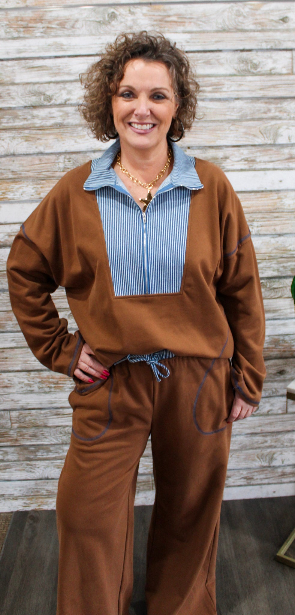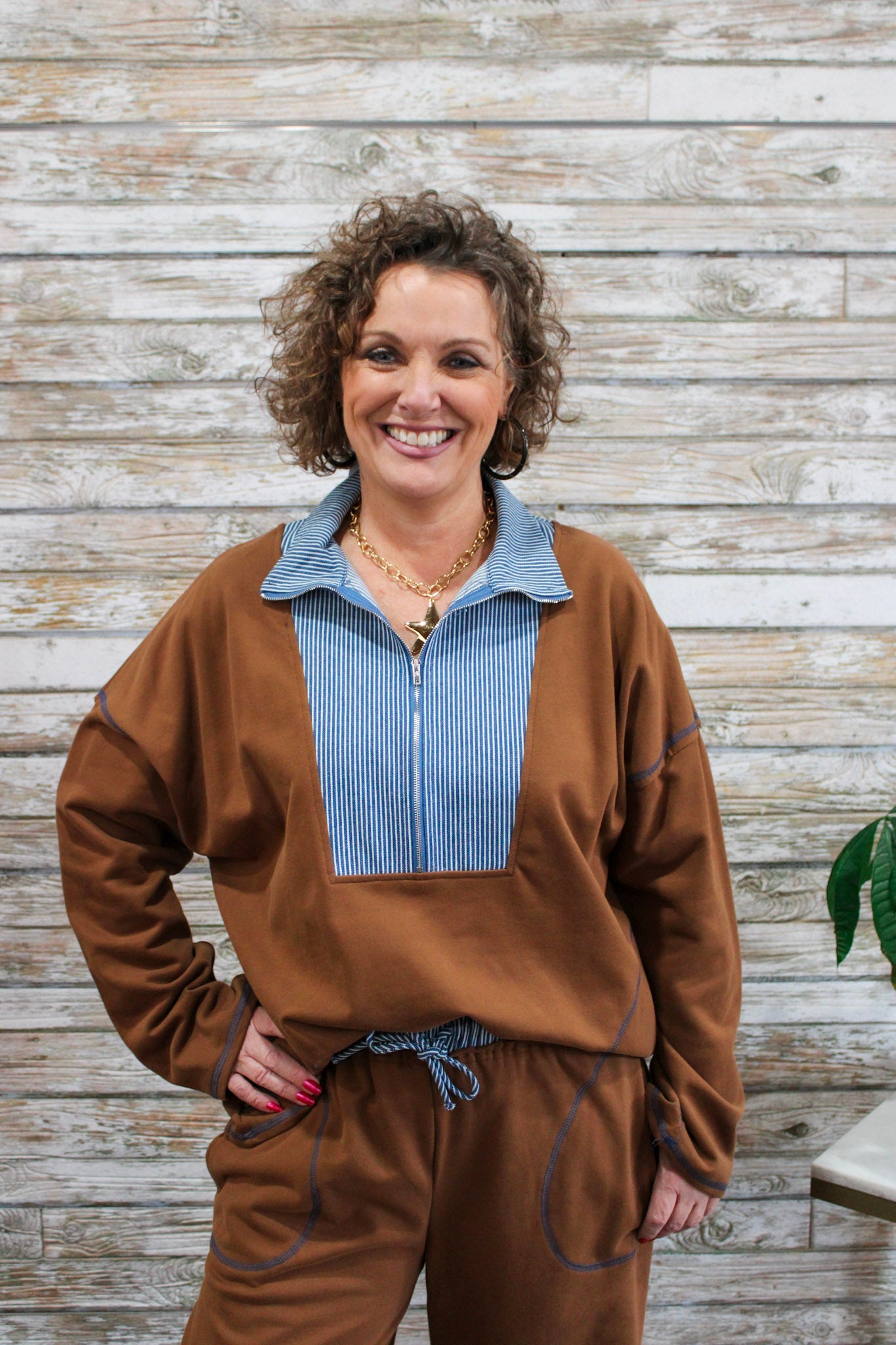 The Metro Zip-Up Sweatshirt blends sporty comfort with urban style. Crafted from soft French terry, it features a semi zip-up front and a unique denim neck detail for a modern, polished touch. Perfect for layering or wearing on its own, it’s a versatile piece for casual days and weekend adventures.