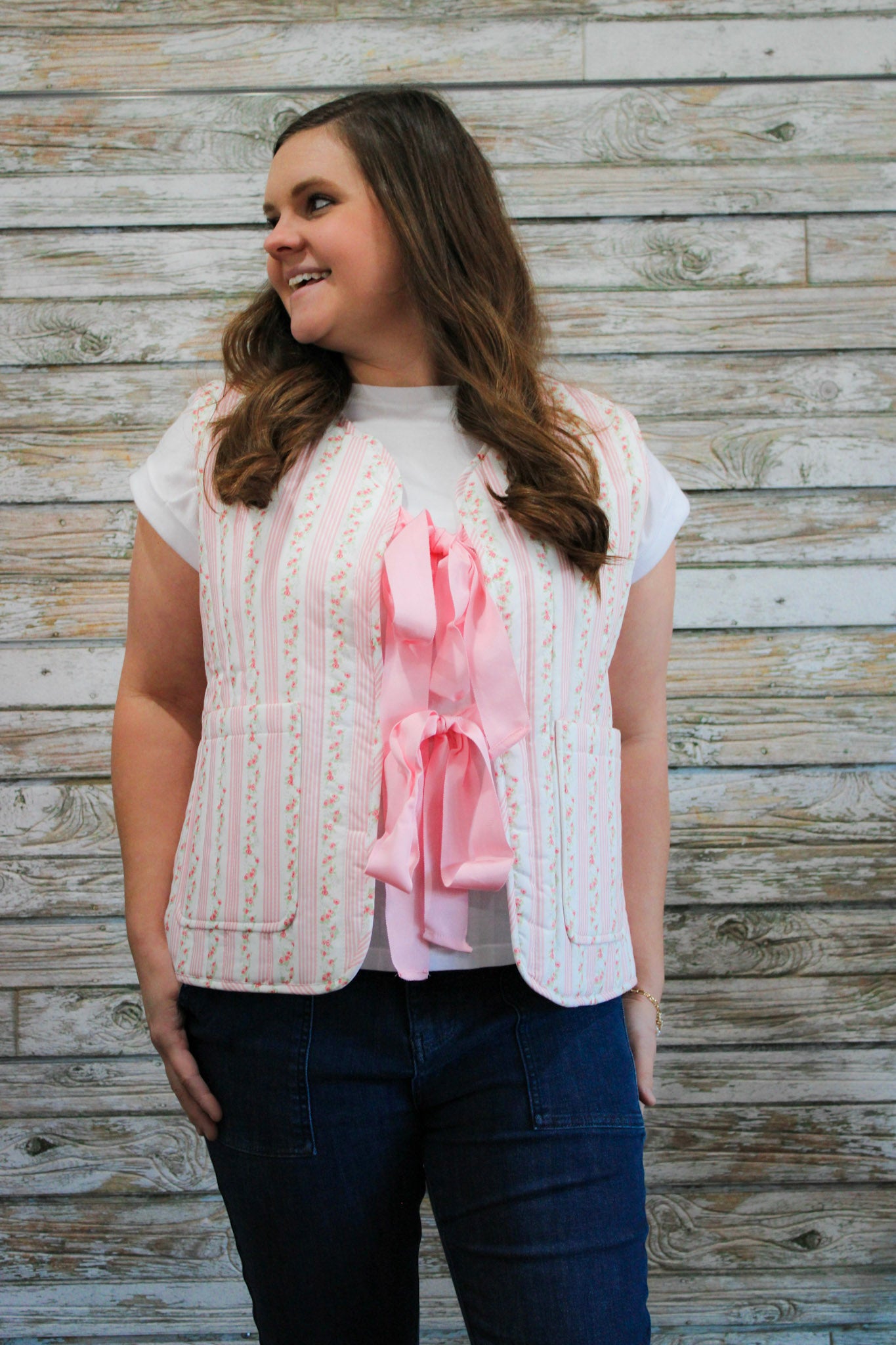 Add a playful touch to your wardrobe with our Quilted Floral Bow Vest. This vest features a unique Quilted Floral wallpaper print and a bow tie front for added style. Stay warm and stylish with the added padding and jacket design.