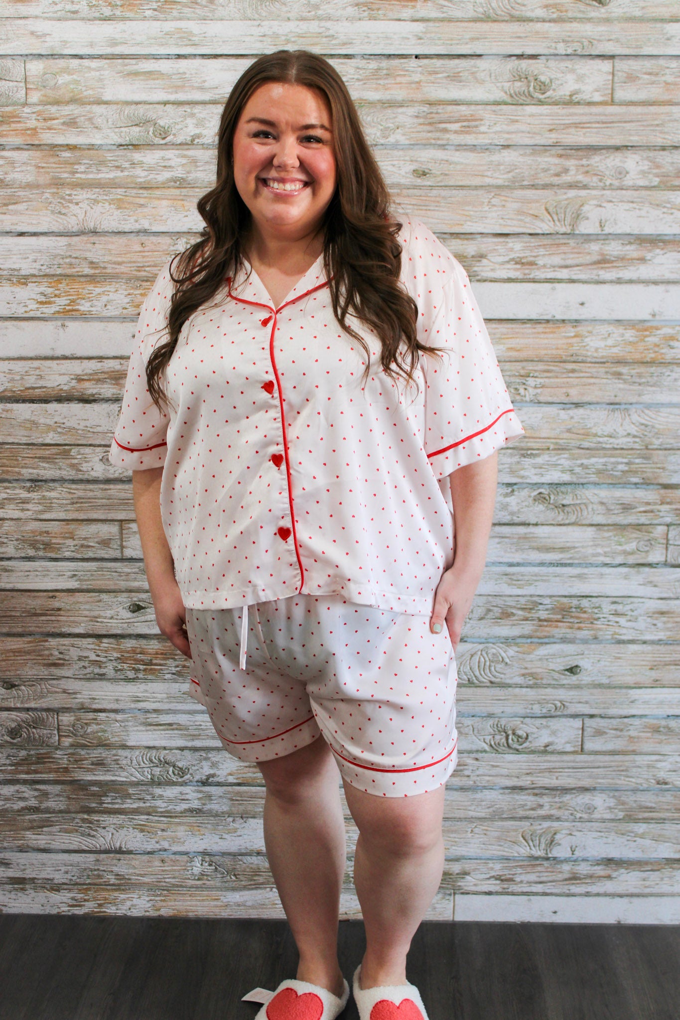 Make your Valentine's Day extra special with this satin PJ set. Featuring a charming heart design and heart-shaped buttons, these white pajamas are the perfect combination of cute and comfortable. Get ready for a cozy and romantic night in!