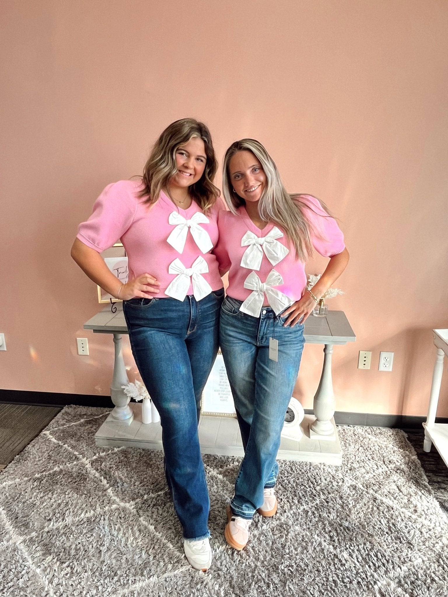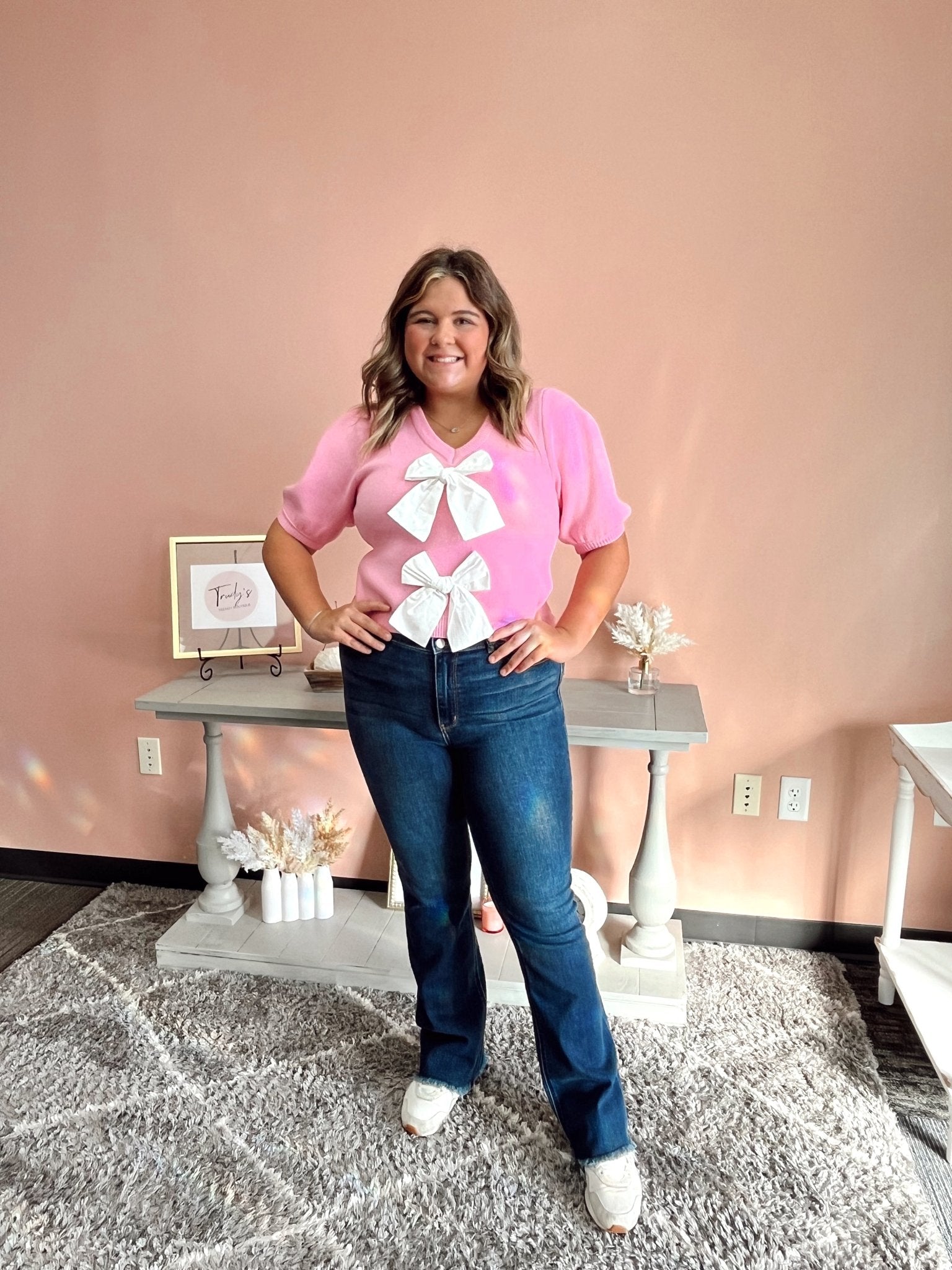 Show off your playful side with our All About the Bow sweater top! This quirky top features short puff sleeves and a bow front, adding a touch of fun to any outfit. Stay stylish and comfortable all day long with this unique piece.