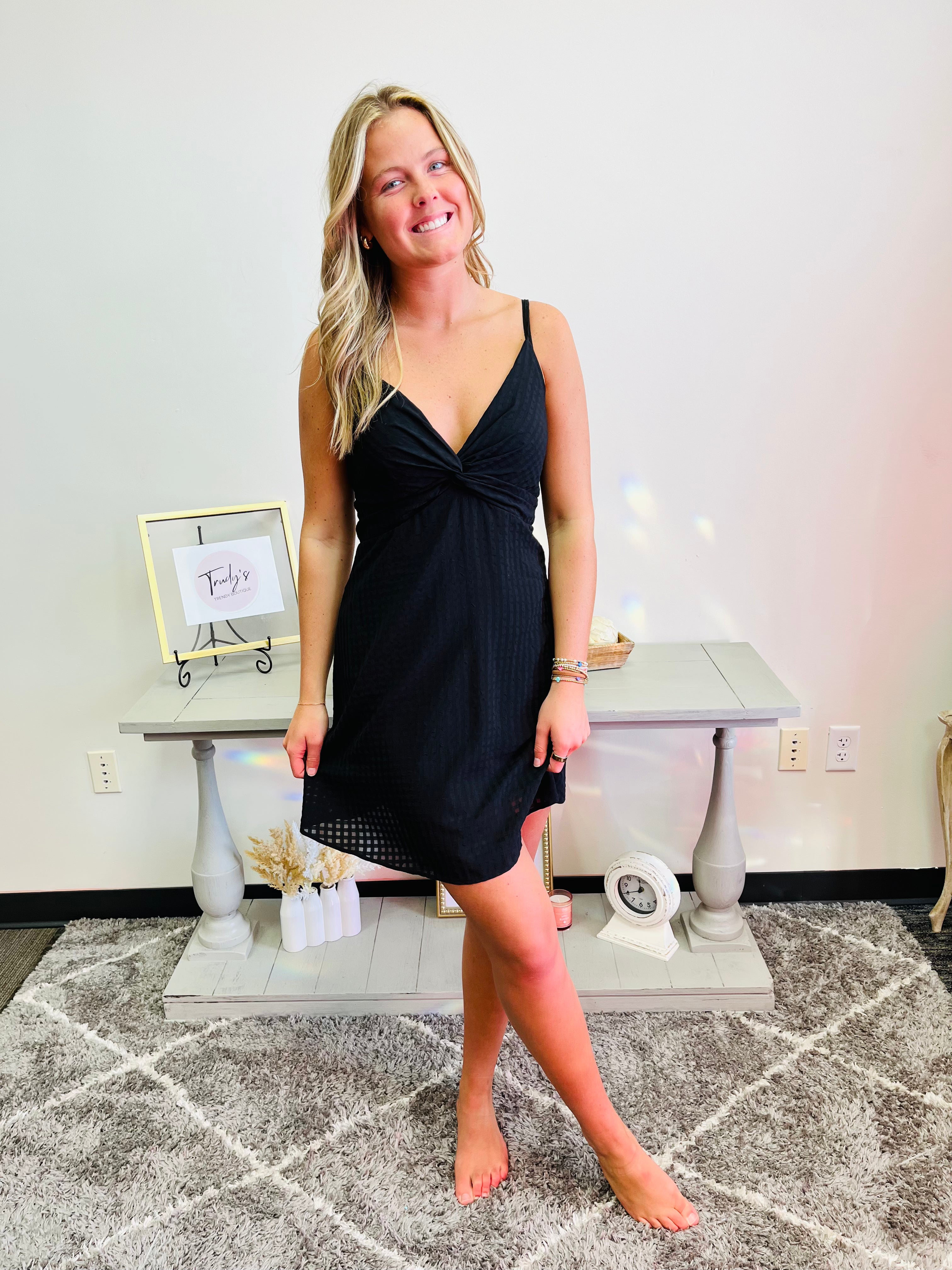 Unleash your playful side with our Black Checker Dress. This tone on tone checker textured woven cami dress features a front twist for added flair, while the lining ensures a comfortable fit. Perfect for standing out at any event!