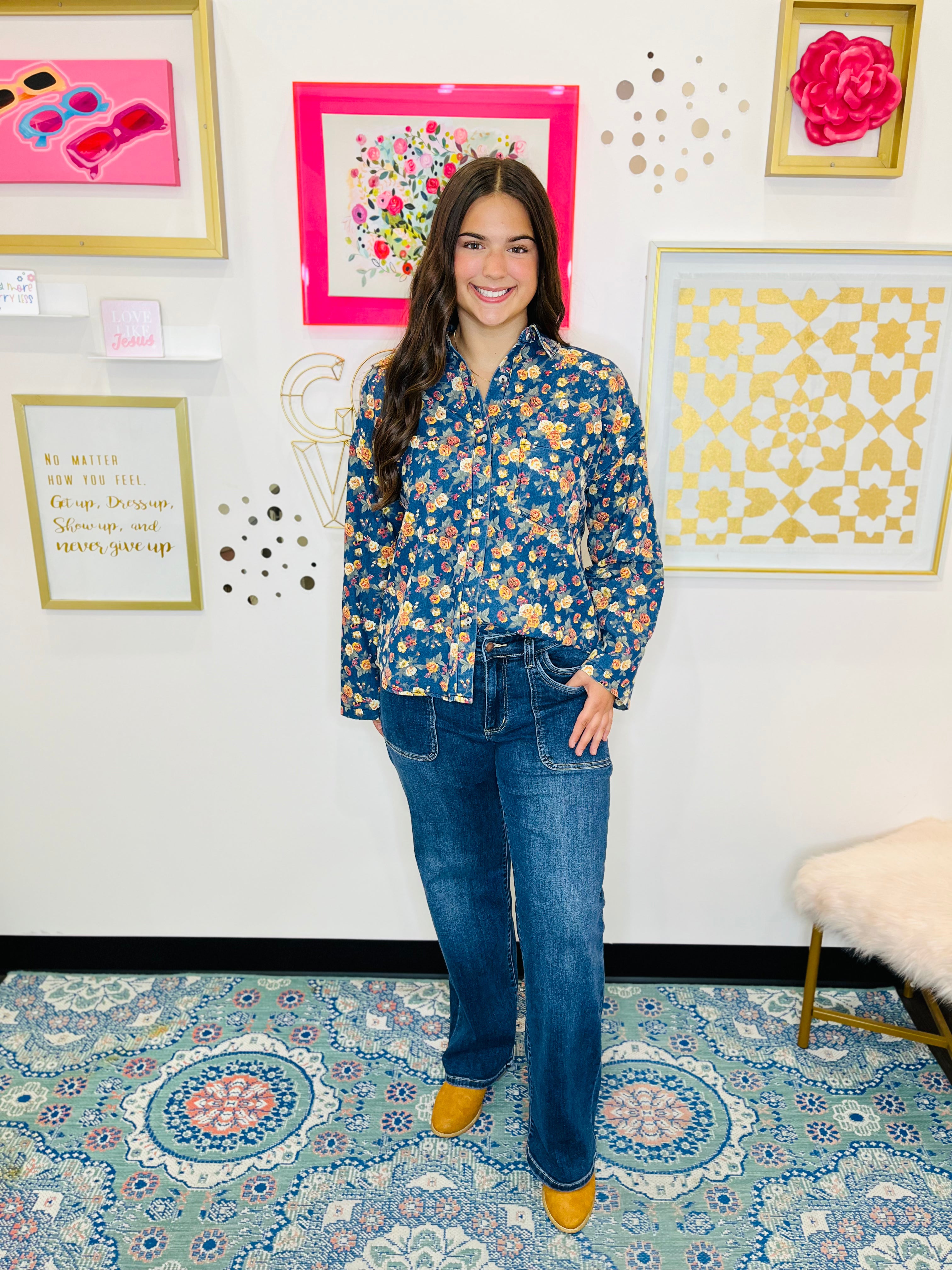 The Blossom Floral Jacket is a chic, boutique-inspired layering piece. Crafted from soft denim, this jacket features an all-over floral print that adds a fresh, feminine touch to casual outfits. Designed with a classic button-front closure and versatile fit, it pairs effortlessly with jeans, skirts, or dresses, making it perfect for transitional weather or layering over your favorite tops.