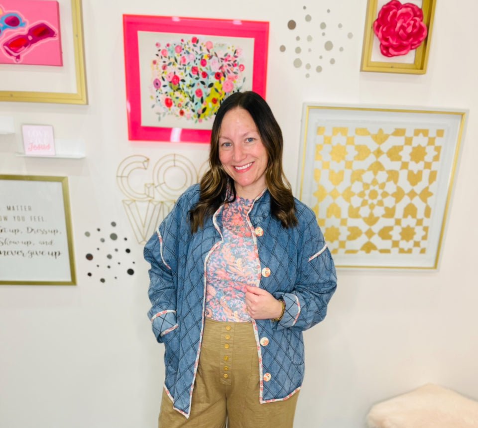Elevate your casual wardrobe with the Blossom Trail Quilted Denim Jacket. Featuring an oversized, relaxed fit with drop shoulders, this jacket combines comfort and style effortlessly. Diamond-quilted detailing adds texture, while floral print buttons and piped edges in contrasting floral fabric bring a feminine, playful touch. The collared neckline and button-down front make it a versatile layering piece for transitional weather, perfect for pairing with jeans, skirts, or dresses.