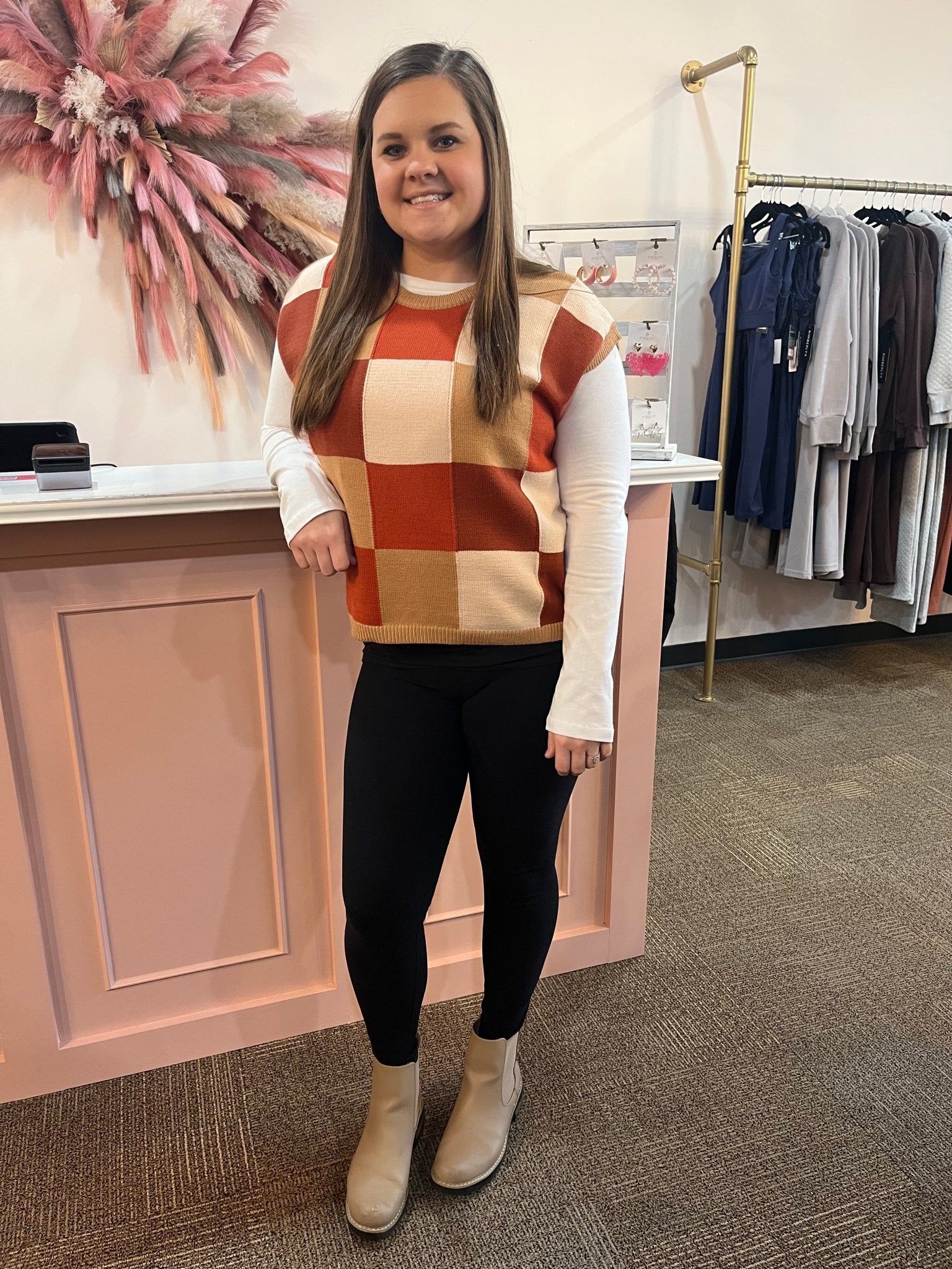 Unleash your confident vibes with this multi-colored checkered knit sweater vest! The ribbed neckline, shoulders, and hem add an extra touch of style and comfort. Perfect for adding a pop of color and personality to any outfit. (Go ahead, show off a little! 😉)