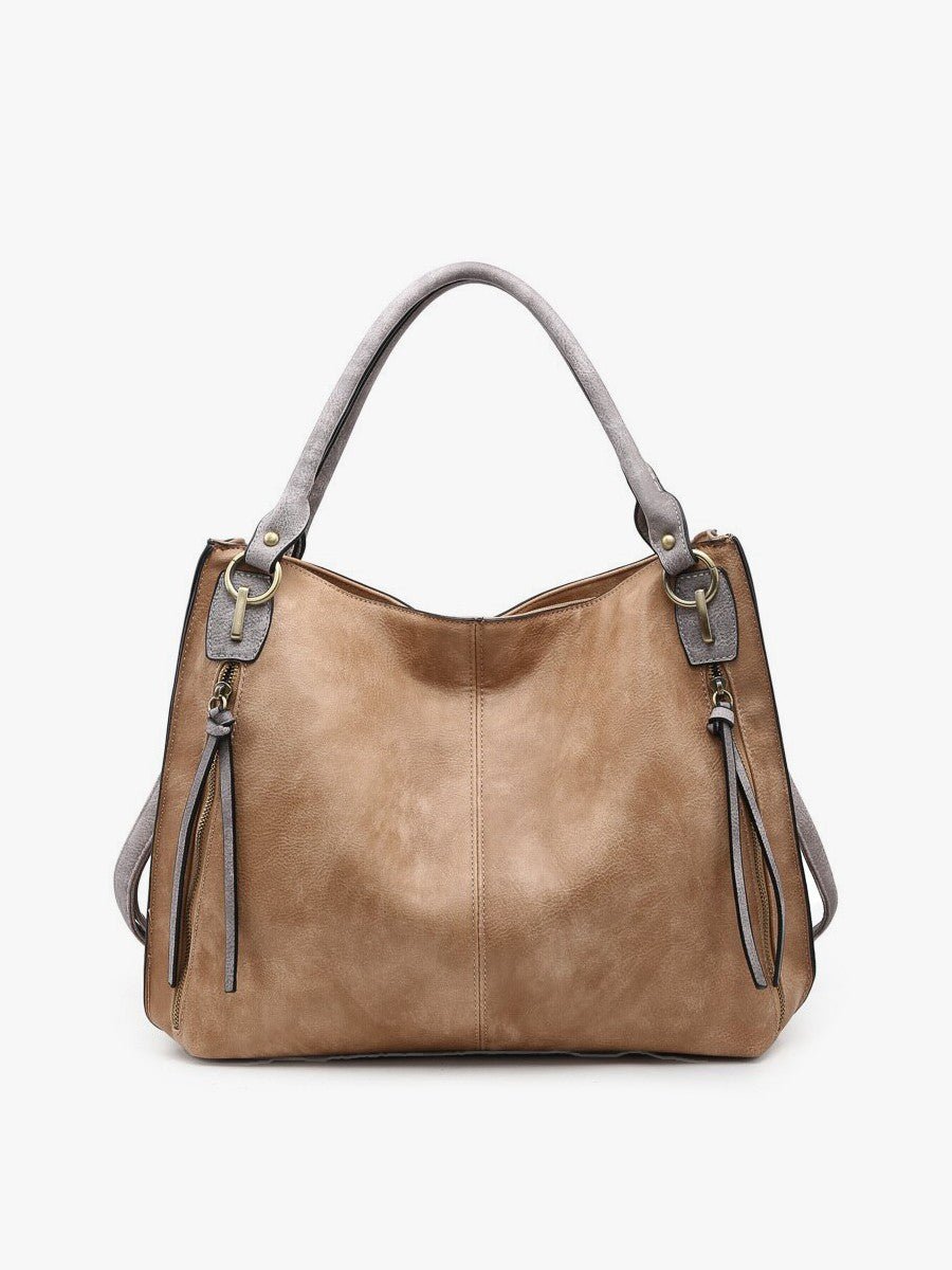 Distressed tote with front zipper pockets and adjustable/detachable shoulder strap.
