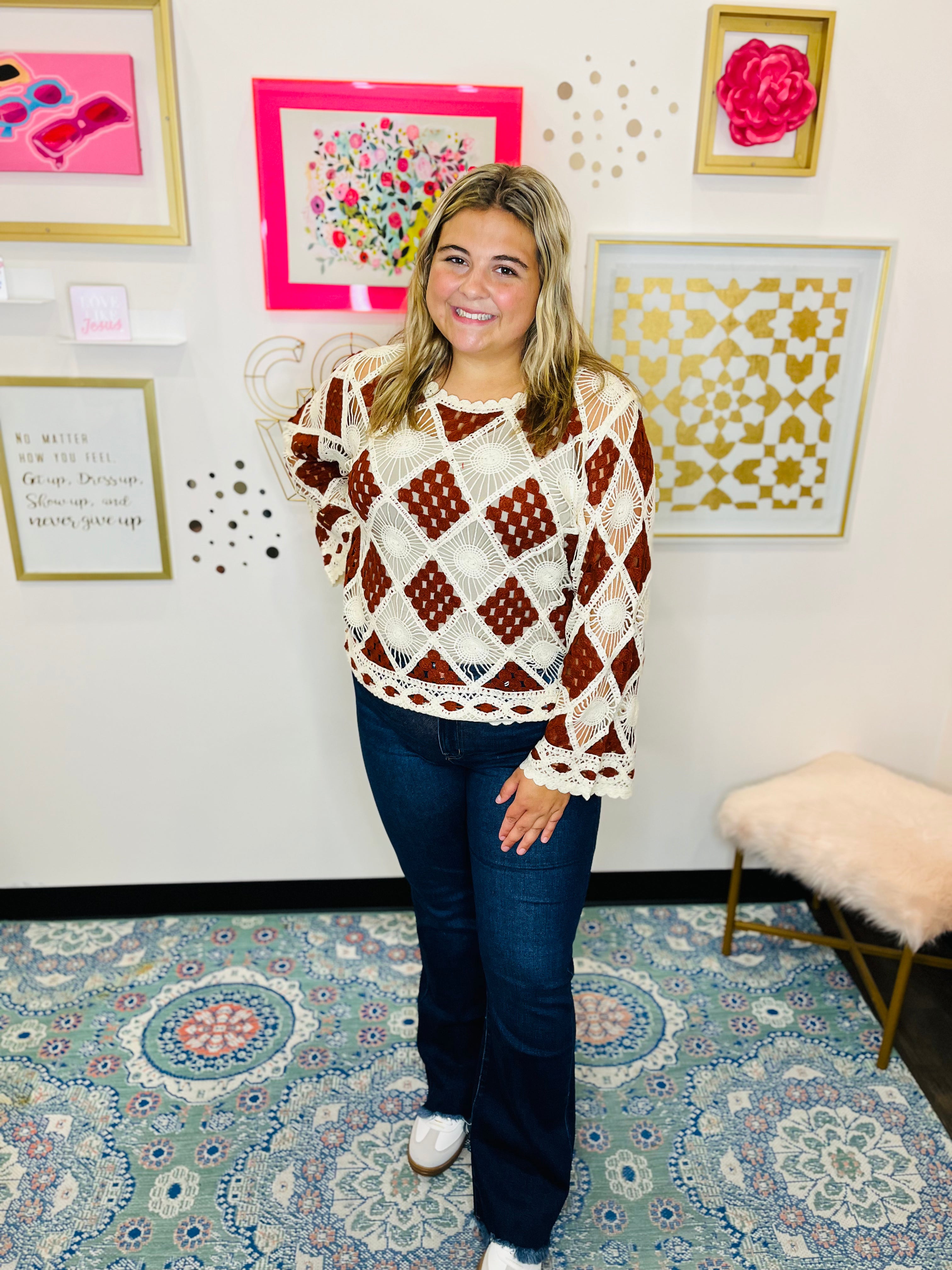 SEO keywords included: diamond crochet knit top, lightweight crochet blouse, women’s boutique knitwear, textured crochet top, chic layering top, boho crochet shirt.