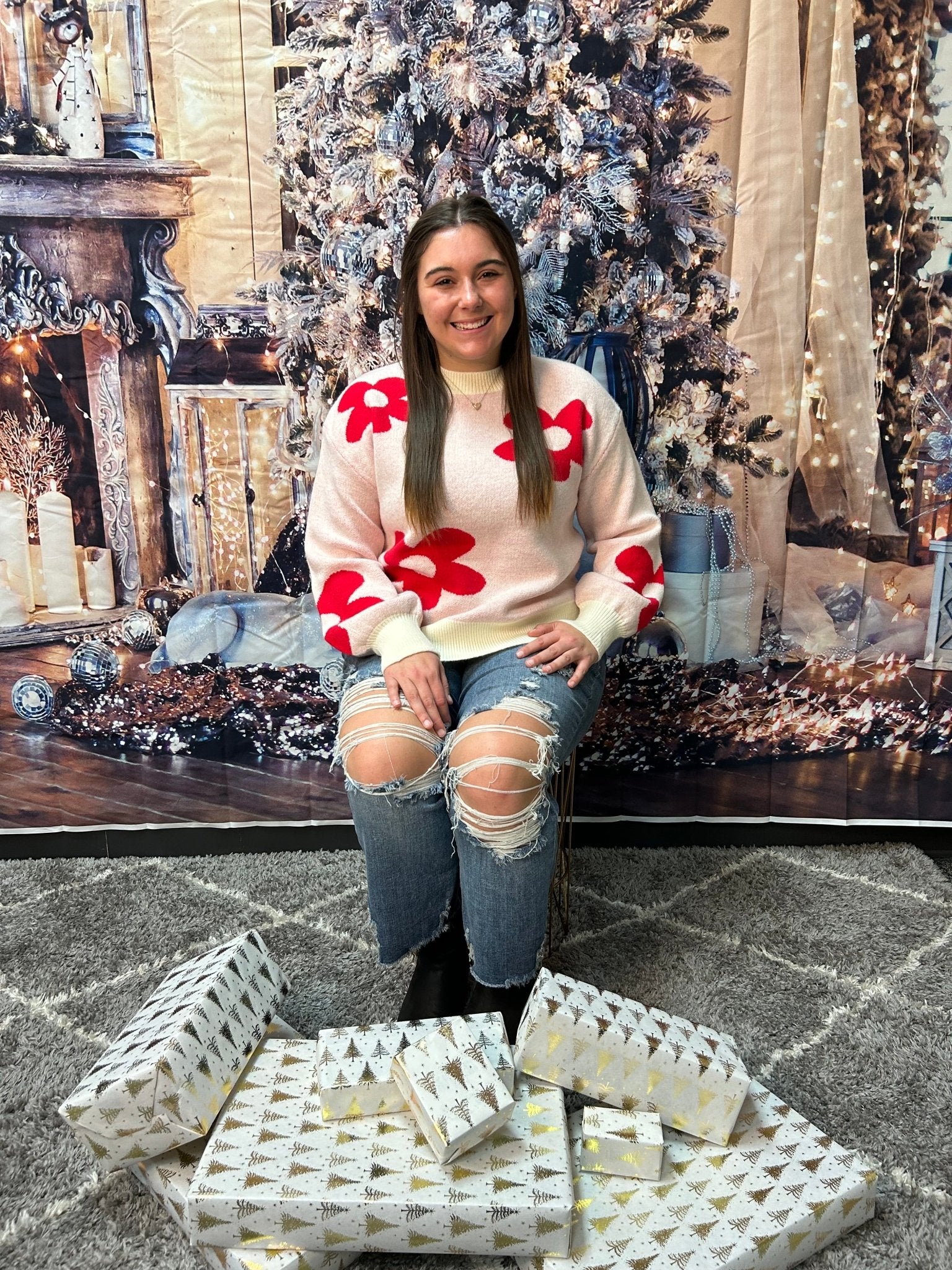 This red daisy flower sweater will have you dreaming of flowers.  This sweater is cozy and will have you ready for those cold months.