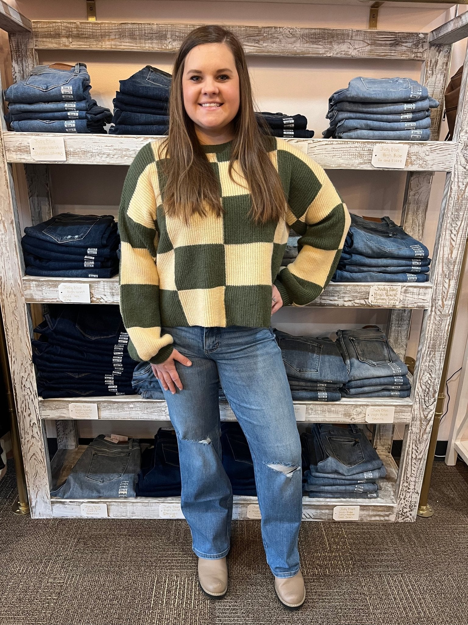 This sweater will have you all in the checkers.  It is an oversized, ribbed crew neck, soft sweater that you will want to wear everyday!