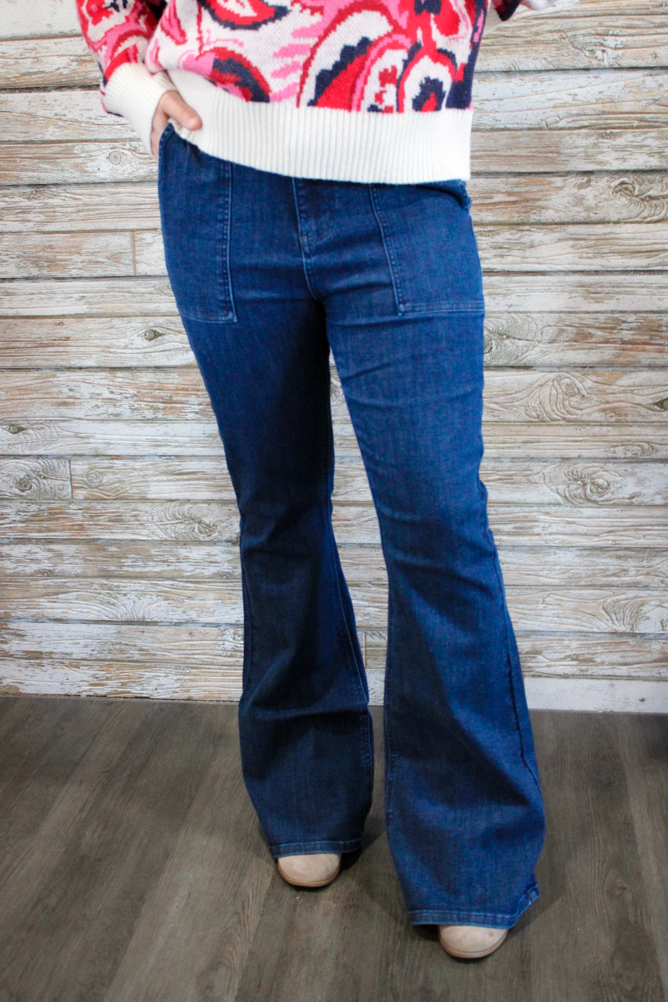 The flare leg elongates your shape, while the patch pocket detail adds a chic, retro-inspired touch that pairs beautifully with sweaters, bodysuits, and graphic tees. Whether you're dressing up for a night out or keeping it casual, these figure-flattering Judy Blue jeans are the perfect addition to your everyday wardrobe.