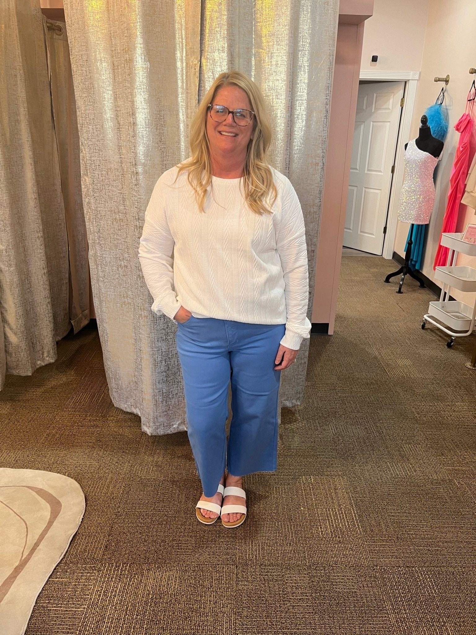 Introducing Judy Blue Tummy Control Crop! Slay in high waist comfort and slimmer silhouette with wide leg design. Perfect for a sky blue summer look.