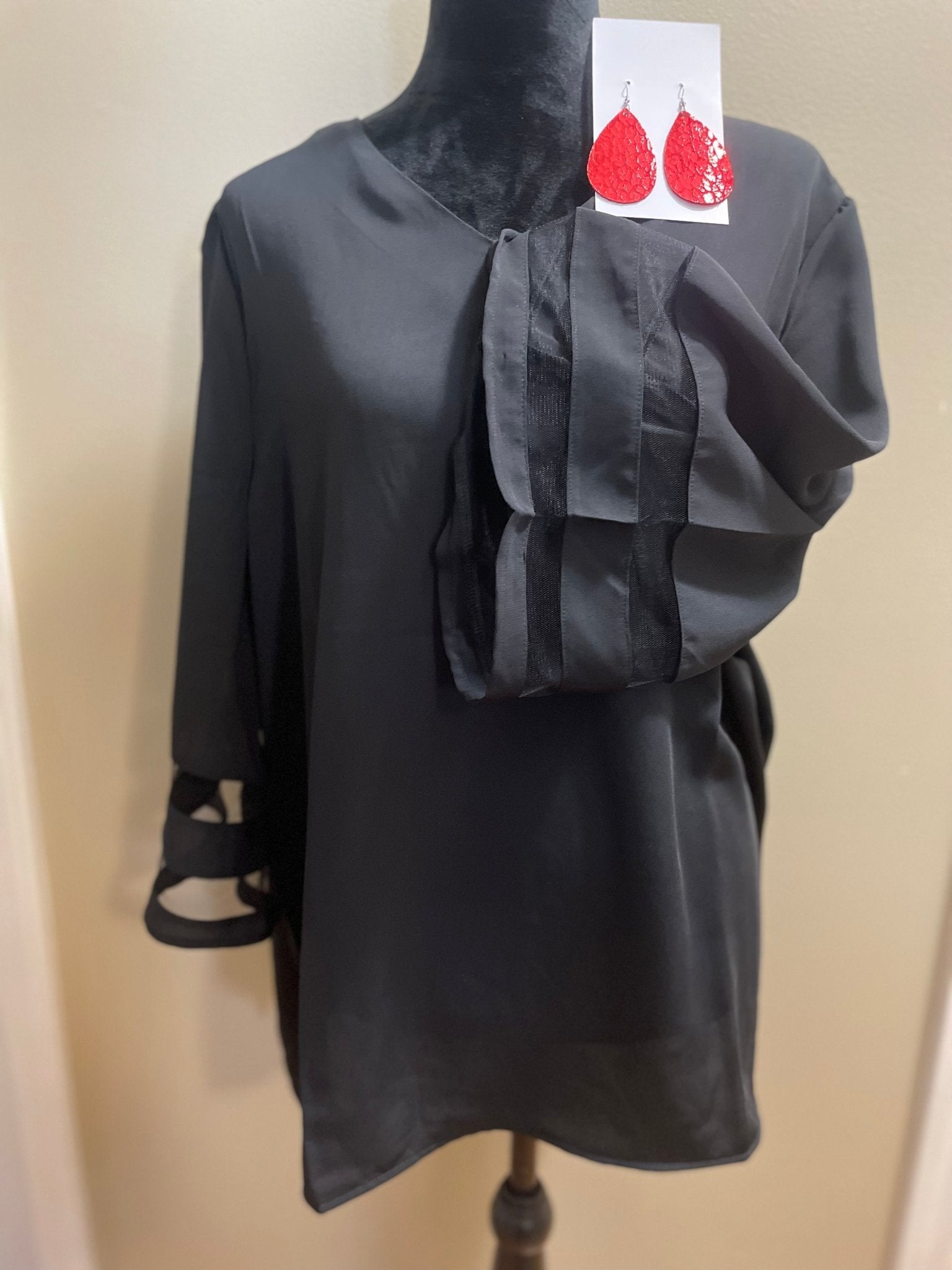 This is the perfect bell sleeve top. The sleeves are 3/4 long, the perfect length. Dress this top up and hit the town!