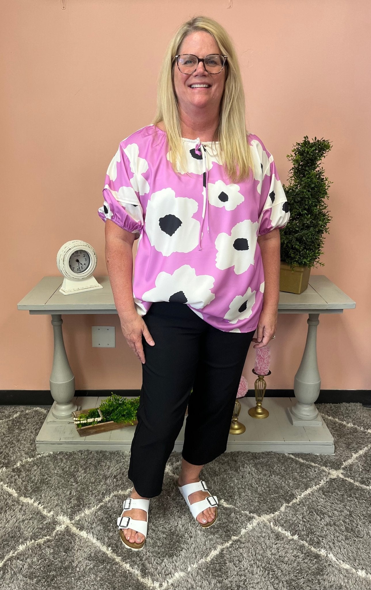 Add a touch of magic to your wardrobe with our Magical Bouquet Pink Top. This charming floral tie front blouse features puffed short sleeves for a playful look. Perfect for any occasion, this top will have you feeling blooming beautiful.