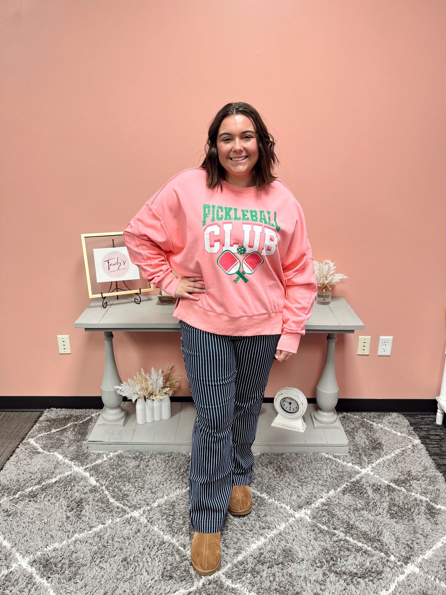 Serve up some style with our Pickleball Pink Crewneck! This oversized sweatshirt features a fun "Pickleball Club" graphic print and an asymmetric high-low cut, perfect for staying comfortable and on-trend. The sleeve panel adds an extra touch of flair. Game on!