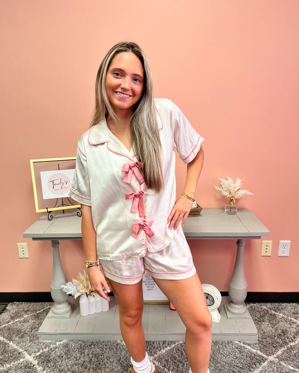 Upgrade your lounge game with our Satin Short Sleeve Bow PJs. Silky smooth satin fabric makes for a luxurious experience, while the cute bow design adds a touch of playfulness. The contrast ribbon and piping detail adds a touch of sophistication to these cozy yet stylish pajamas. Sweet dreams!