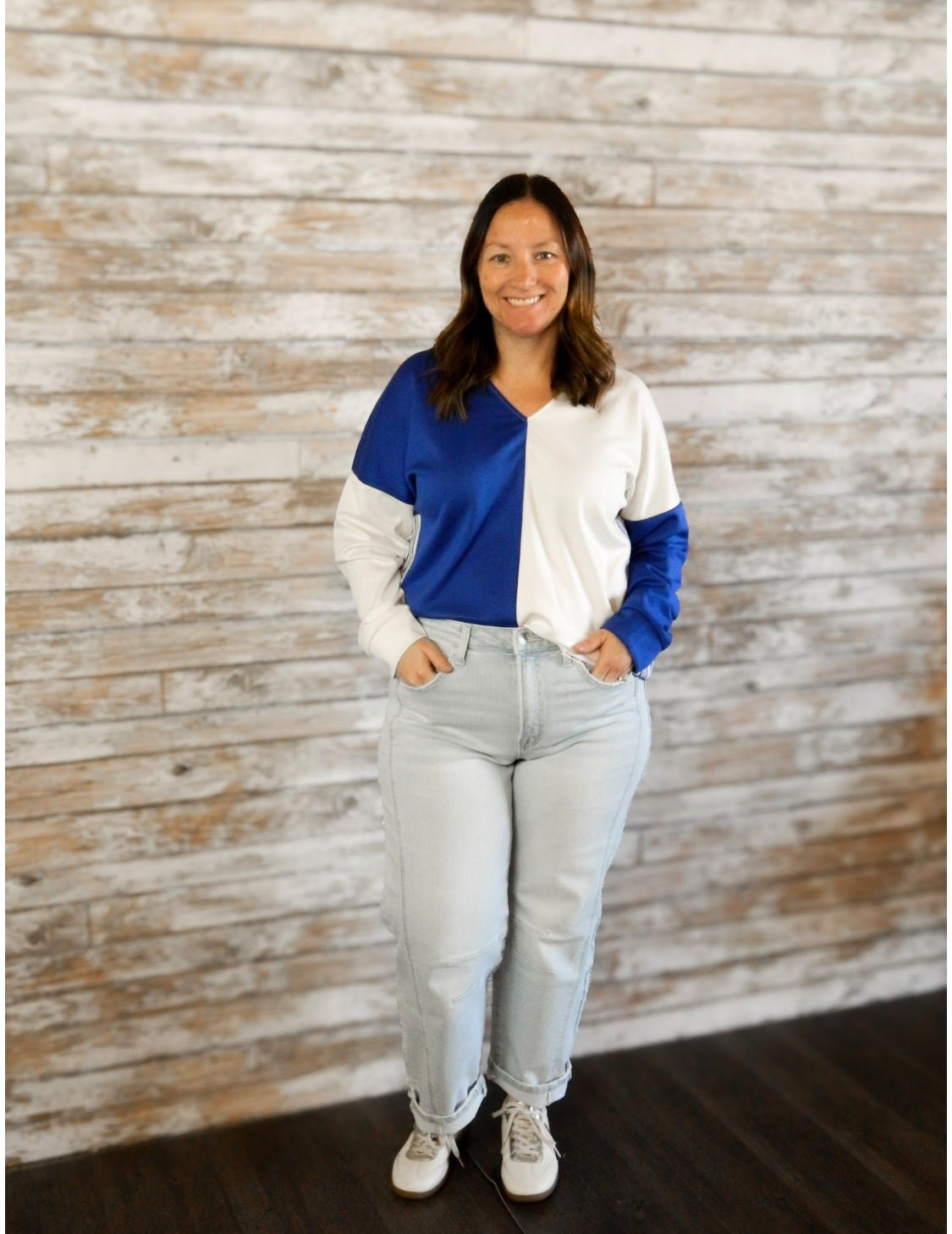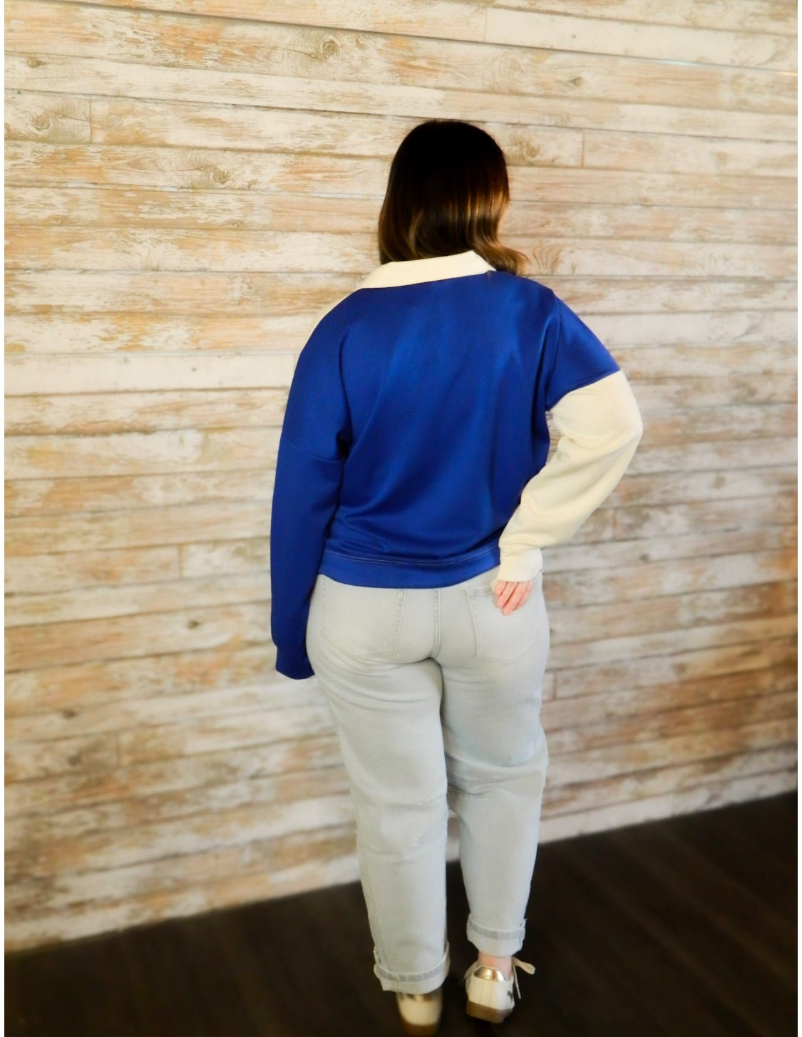 The Side Stripe Ease Top is where sporty meets chic. Designed with a relaxed drop-shoulder fit and a classic collared neckline, this solid color block style stands out with its side band trim accent. Comfortable yet polished, it’s the perfect top to pair with denim or joggers for an effortlessly put-together look.