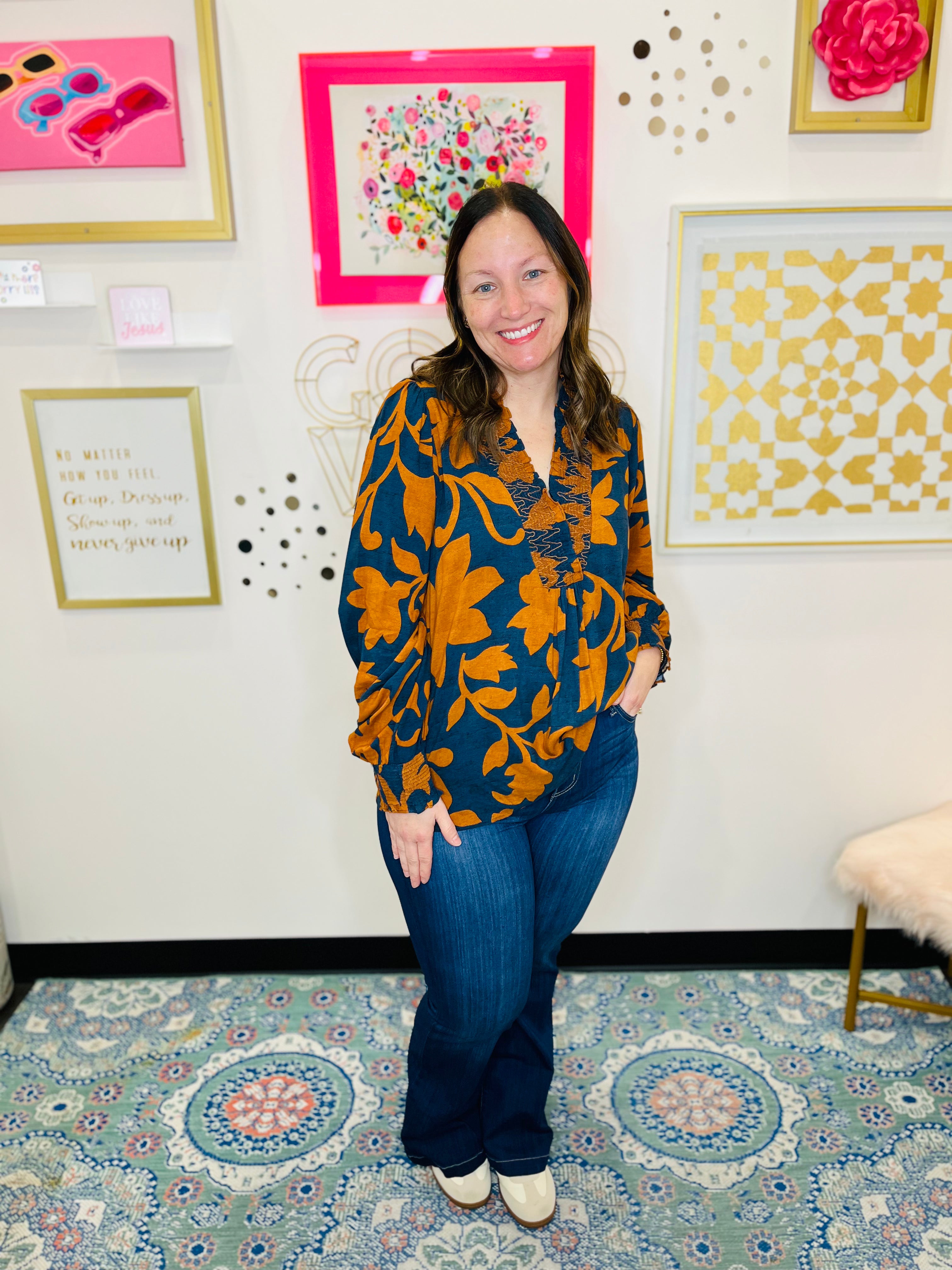 Elevate your casual wardrobe with the Smocked Serenity Rayon Top. Made from lightweight, flowy woven rayon, this relaxed-fit top features a flattering V-neckline with delicate smocked detailing. Long balloon sleeves with smocked cuffs add a touch of romantic elegance, making it perfect for pairing with jeans, skirts, or layered looks for effortless everyday style.