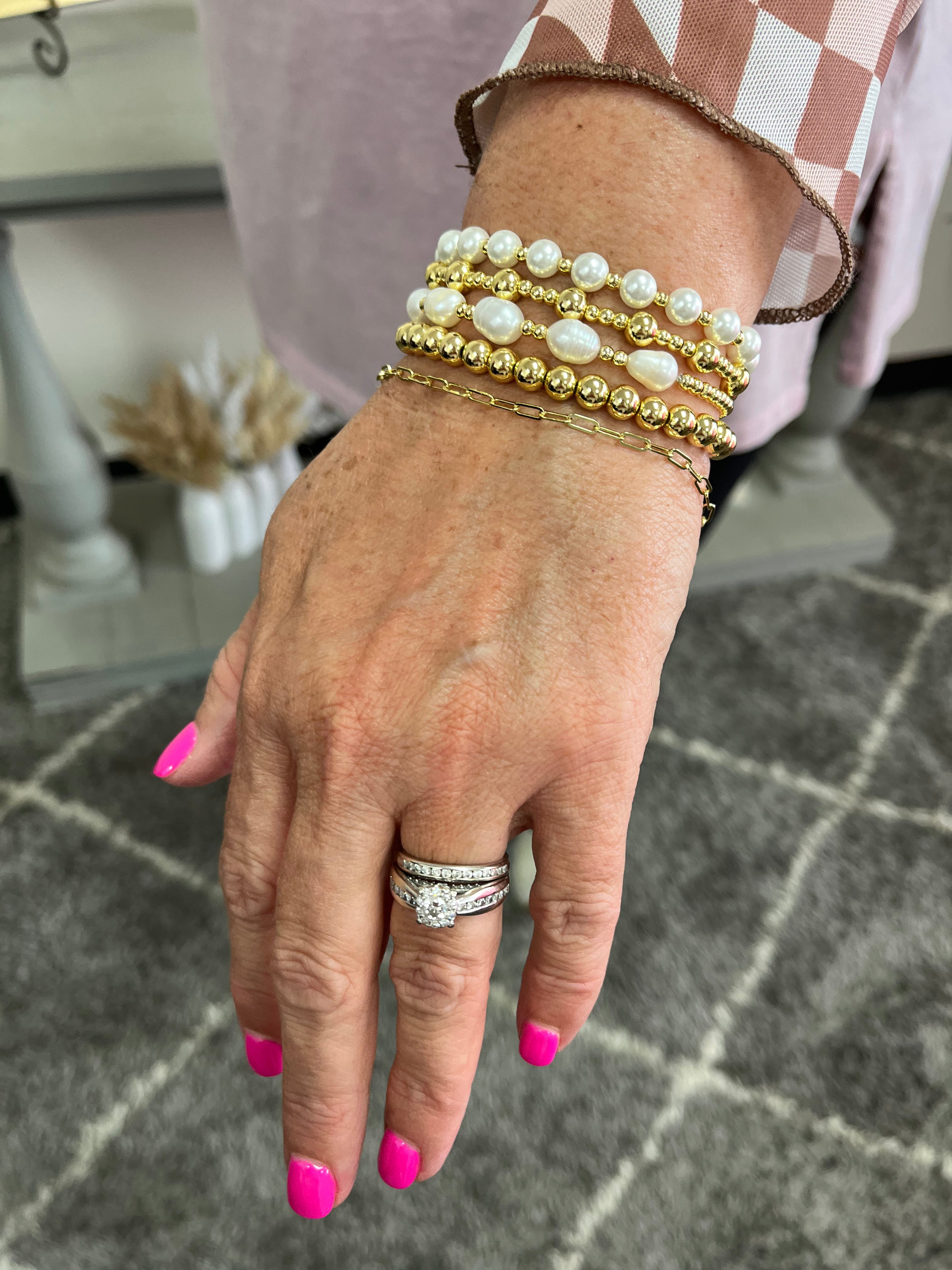 Add some pizzazz to your wrist game with these 5 stackable bracelets in gold and pearls. A playful way to dress up any outfit!