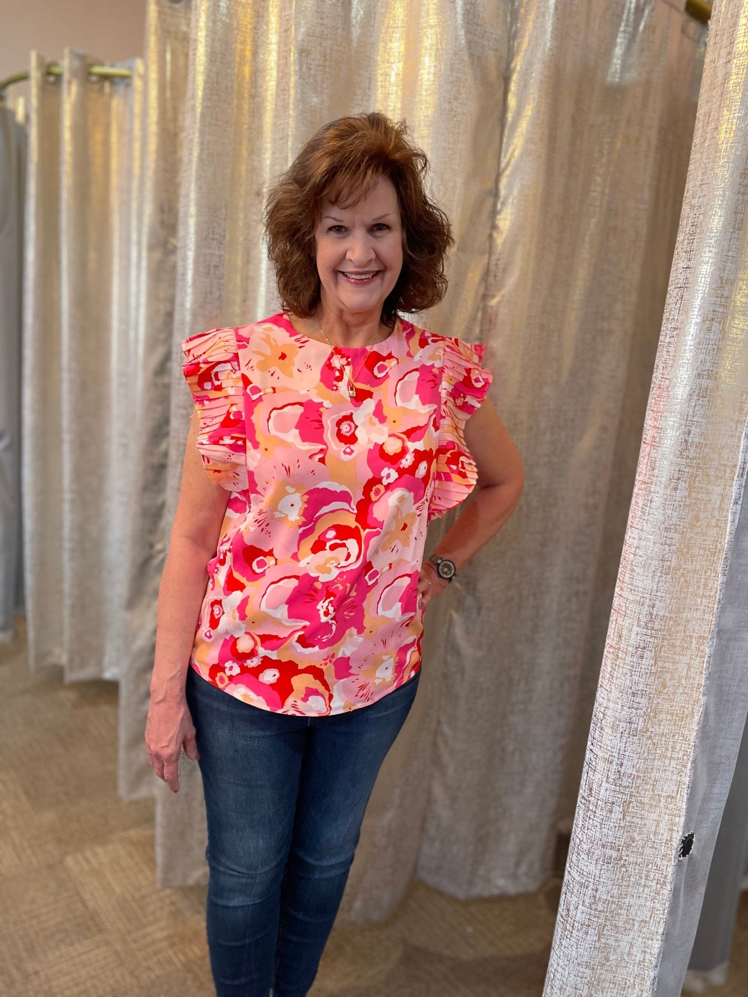 This super fun boat neck top has ruffle sleeves with a back keyhole closure. This floral print top is a summer fun top!