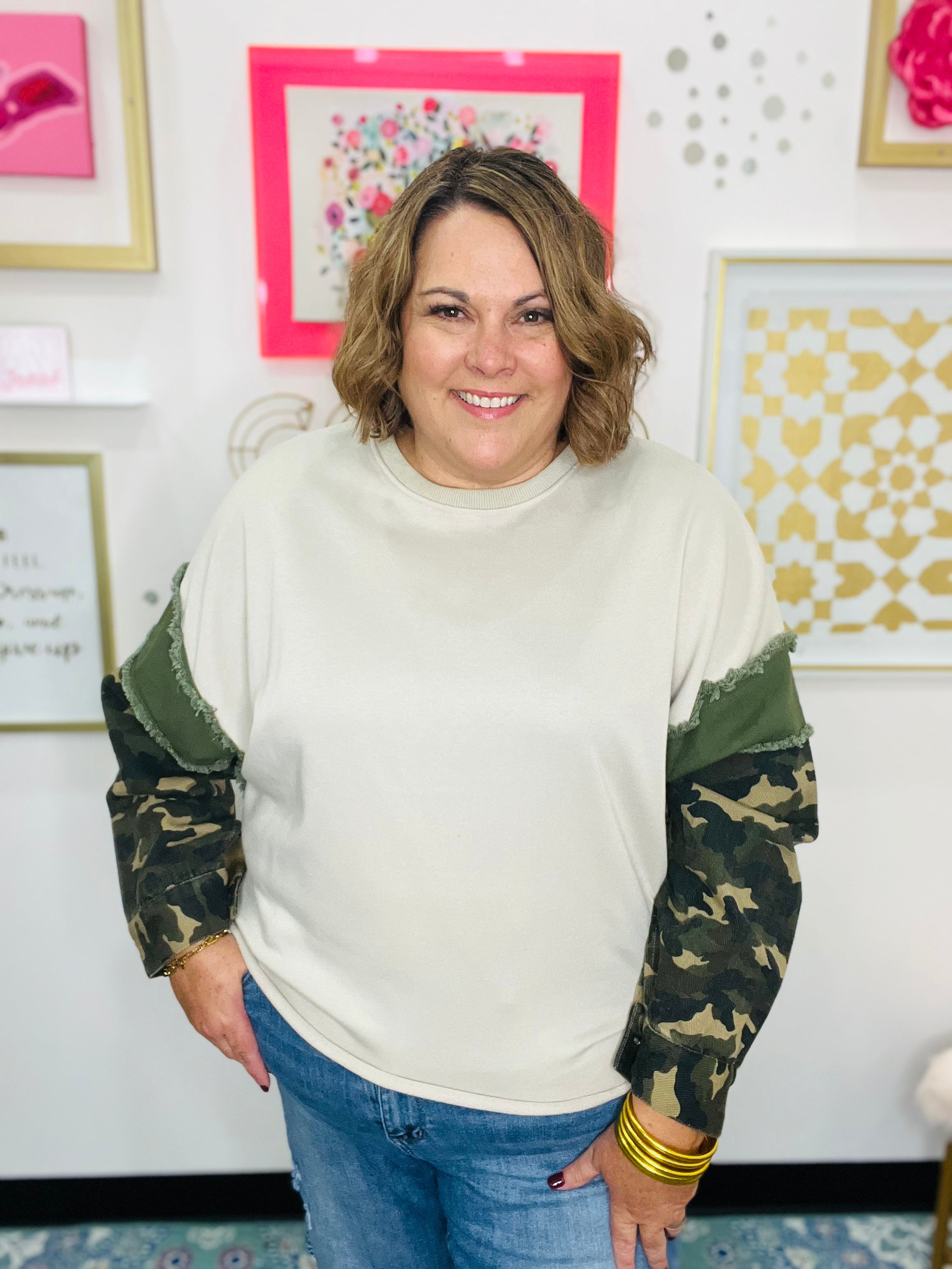 Elevate casual style with the Urban Drift Camo Top. Crafted from soft French terry, this relaxed-fit top features contrasting camo sleeves and frayed-edge detailing for an effortlessly edgy look. The comfortable silhouette and lightweight fabric make it perfect for layering or wearing on its own, while the unique mix of textures adds a modern, street-style vibe to everyday outfits.