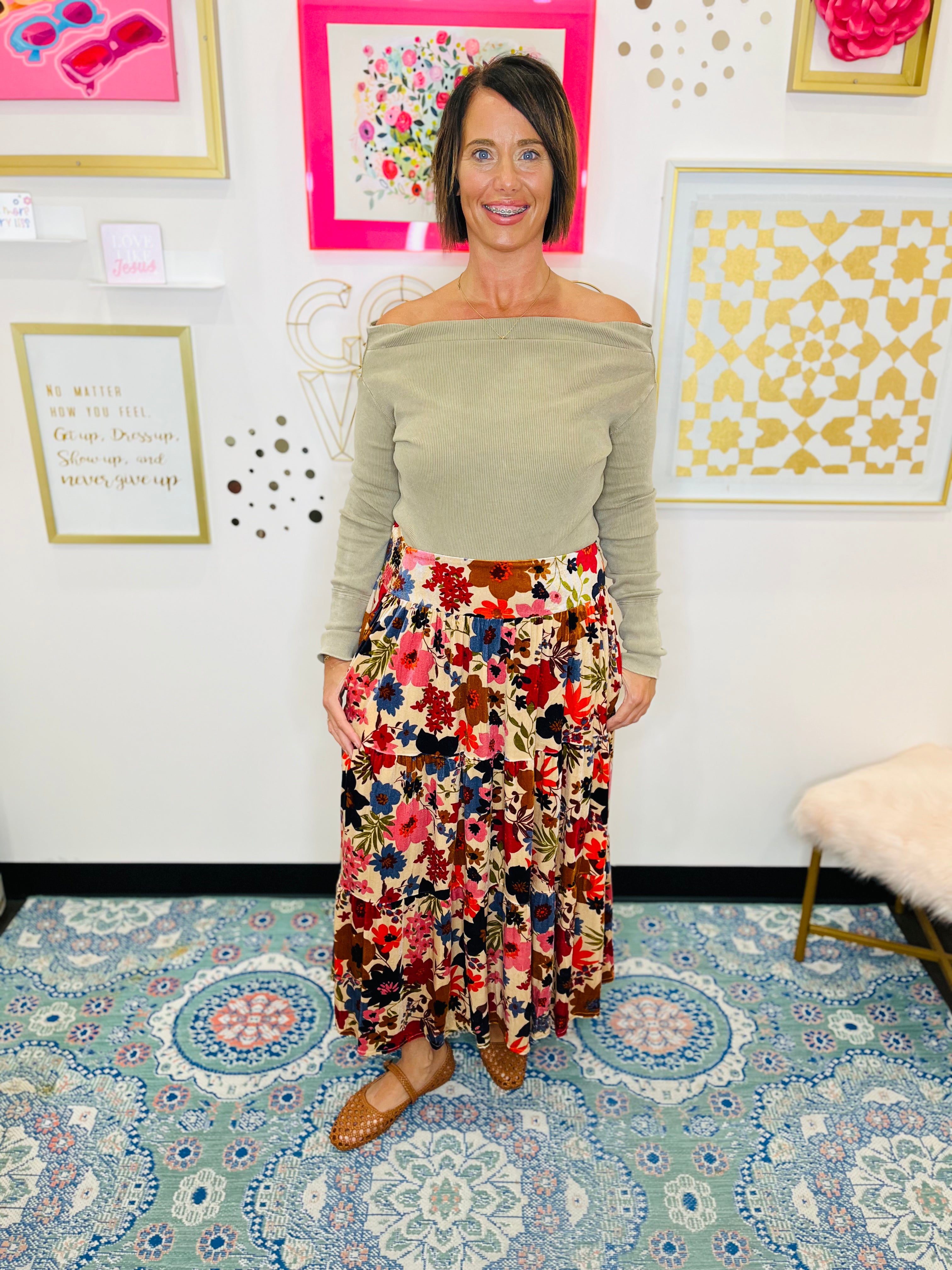 Elevate your wardrobe with the Velvet Meadow Maxi Skirt. Featuring a multicolor floral print on soft, plush velvet, this tiered maxi skirt offers a flowing, feminine silhouette that moves gracefully with every step. The elastic waistband ensures a comfortable, flexible fit, making it perfect for casual outings, special occasions, or layering for a stylish fall look. Pair it with a fitted top or sweater for effortless, on-trend elegance.