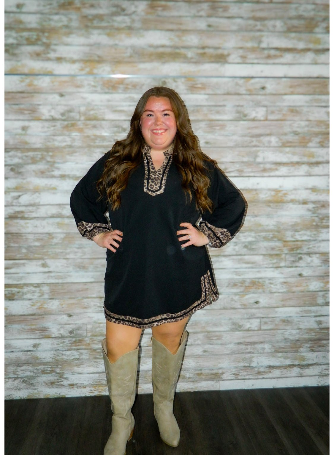 The Wild Harmony Textured Dress blends subtle elegance with a touch of edge. Crafted from soft textured fabric, it features a split neckline accented with bold leopard print trim. Long balloon sleeves with elastic cuffs add a relaxed, feminine silhouette, making this dress perfect for day-to-night styling. Pair with boots or heels for a chic, on-trend look.